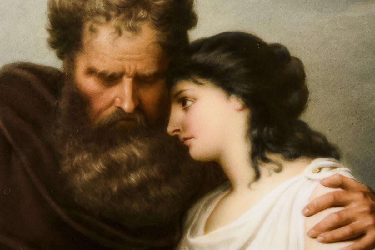 Rechteckige Platte mit der Darstellung der ihren Vater Ödipus führenden Antigone, nach einem Gemälde von Emil Teschendorff (1833-1894).