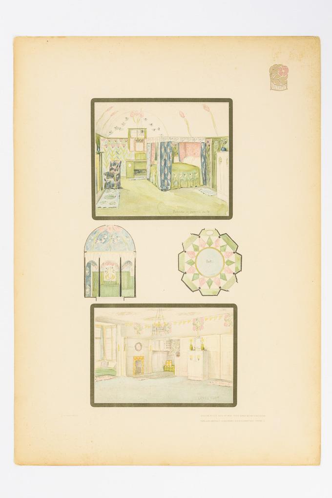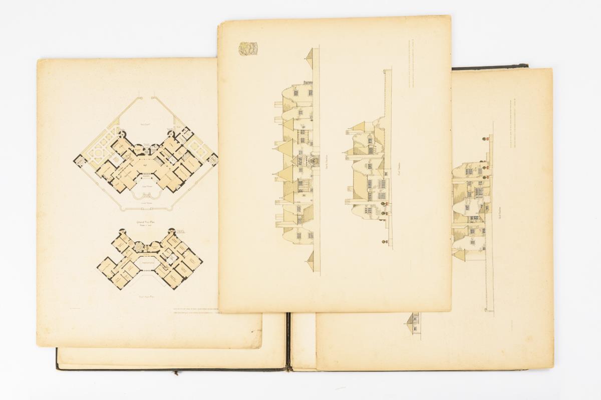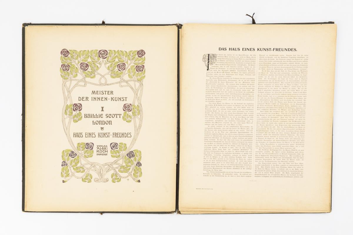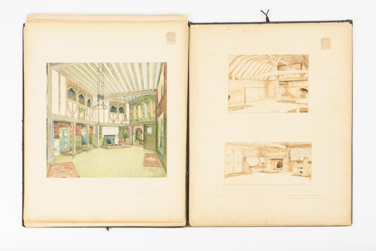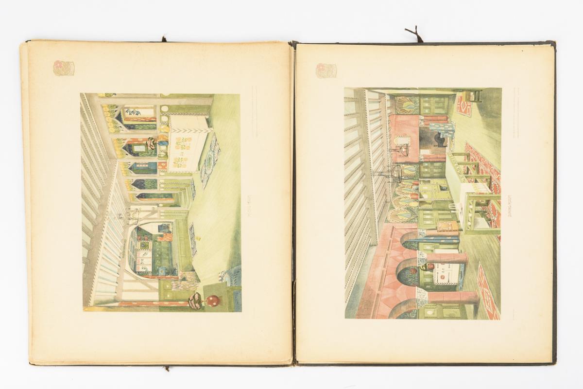 3 Textblätter Autor: Hermann Muthesius. 10 Blätter mit Grundrissen, Zeichnungen der Gesamtanlage und farbigen Innenräumen im Stil der englischen Arts-and-Crafts-Bewegung. Blätter am Rand gebräunt, teils schwach stockfleckig, Mappendeckel lose, aber altersbedingter guter Zustand.