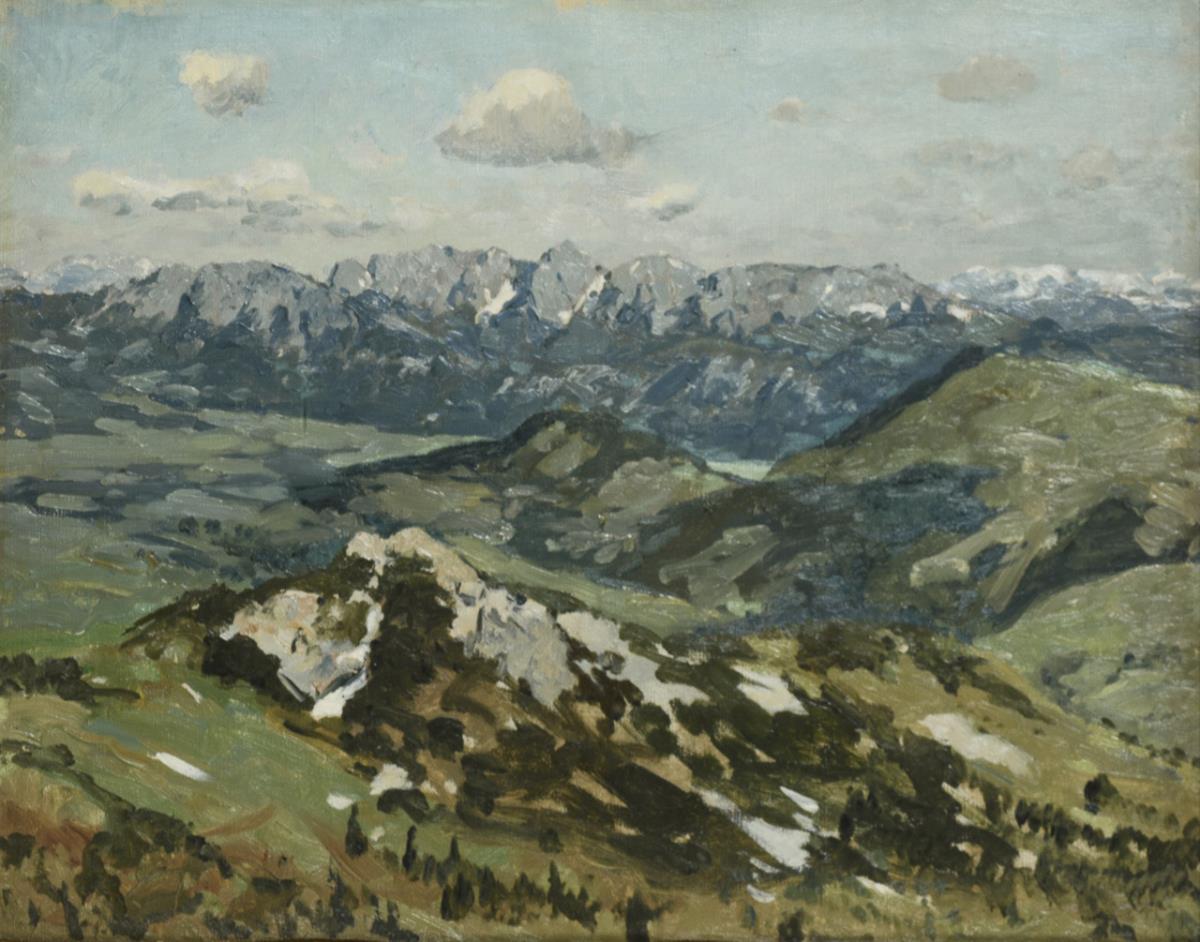 Impressionistisch gemalte Gebirgslandschaft unter heiterem Himmel.
