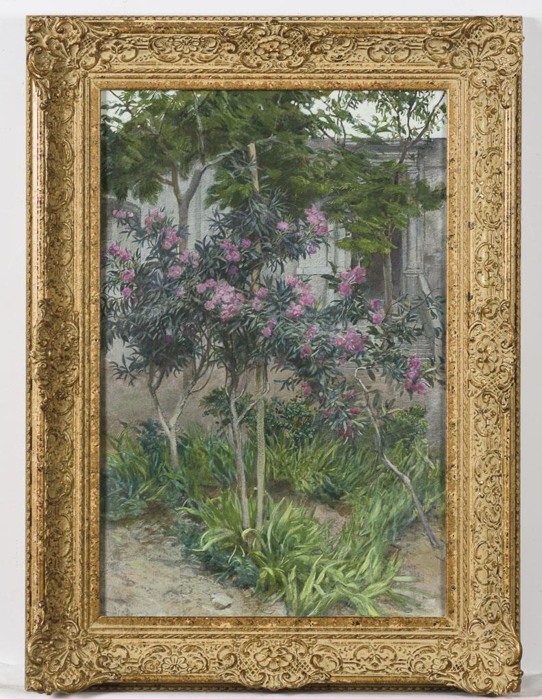 Die Pflanzen vor dem Eingang des antikisierenden Baues unter einem bedeckten Himmel.