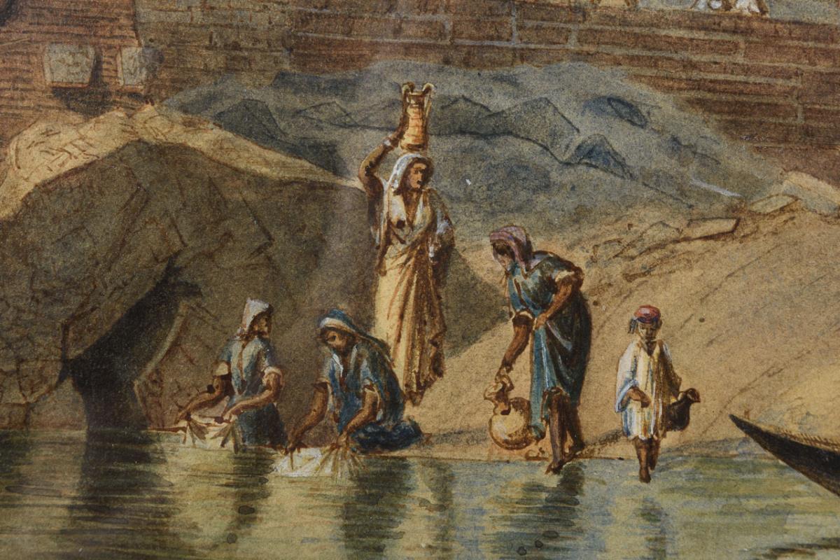 Orientmaler: Tempelanlage am Nilufer mit Staffage