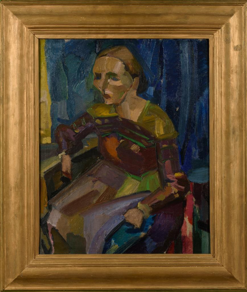 Bildnis einer Frau in vielfarbigem Kleid vor blauem Hintergrund. Altersspuren.