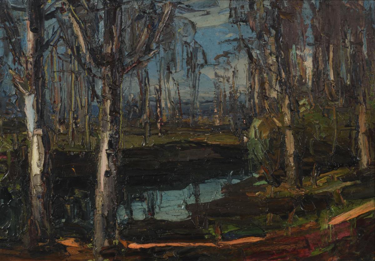Pastos gespachtelte Landschaft mit kahlen Bäumen im Sonnenschein.