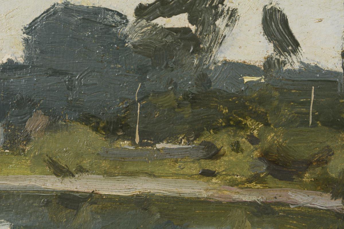 Mit lockerem Pinsel schwungvoll wiedergegebene Spiegelung der Bäume im stillen Wasser sowie Blick zum irischen Dorf am Ufer.