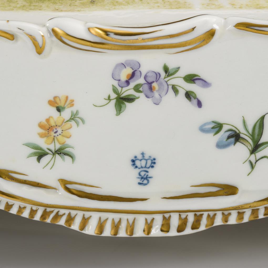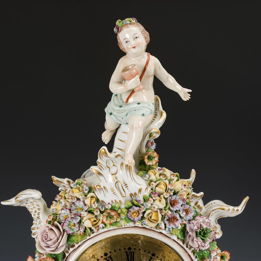 Großes, reich blütenbelegtes Rocaillegehäuse mit vier Putten als Jahreszeitenallegorien, vier Füßen und eingesetztem Quartzuhrwerk; rautenförmiger, reich blütenbelegter Sockel mit vier Füßen. Bestoßungen am Belag.