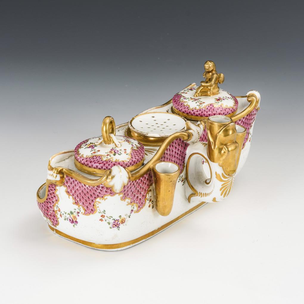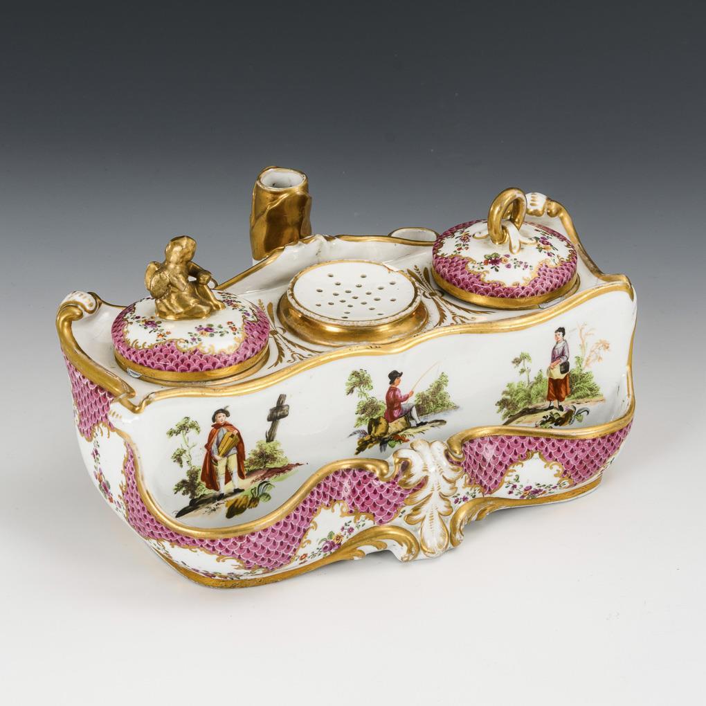 Im barocken Stil gearbeitetes Schreibzeug mit zwei Tintenkammern, 1 Streudose sowie drei Federhaltern. Rosa Schuppenbordüre, Blumen- und Figurenmalerei. Partieller Goldabrieb, Knaufputto mit restauriertem Flügel und bestoßenem Arm, ausgebesserte Bestoßung am Streudosenrand, vereinzelt krakeliert.