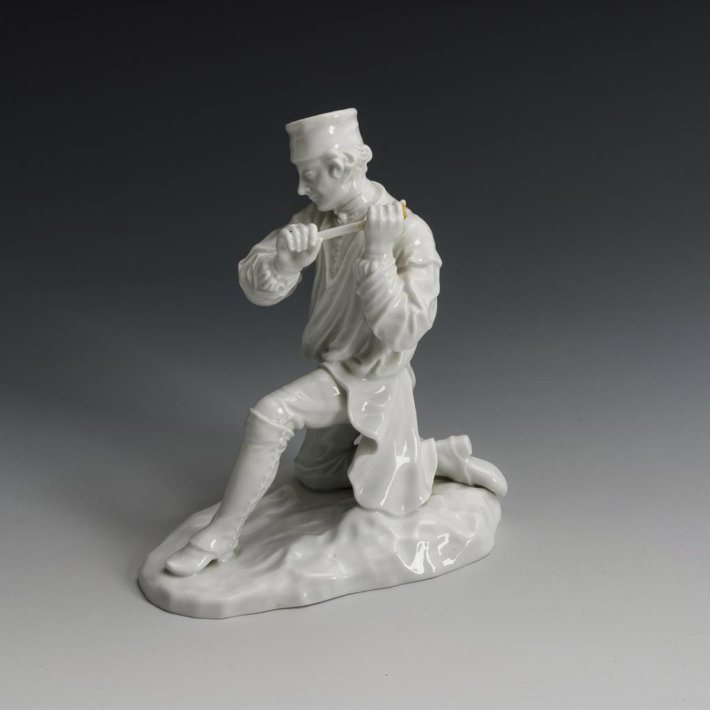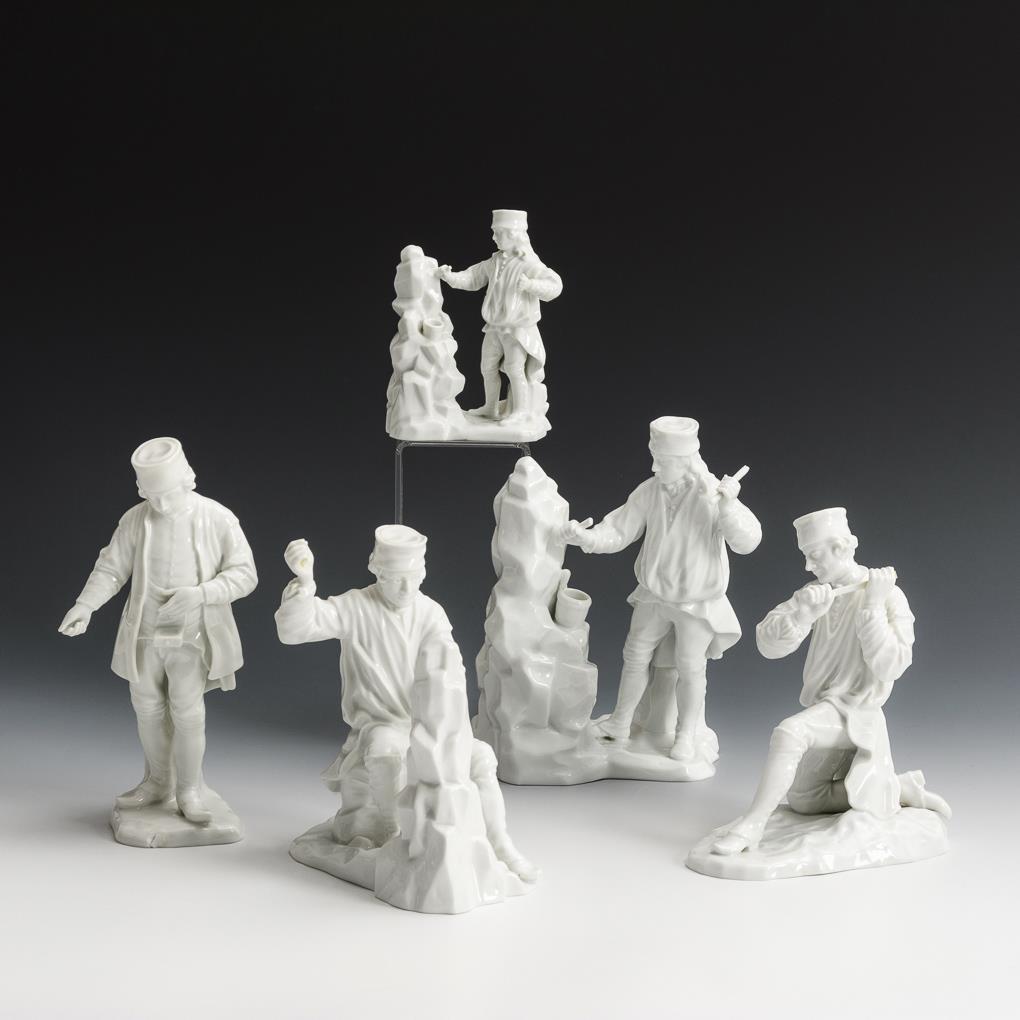 Entwurf von Simon Feilner (1726 Weiden in der Oberpfalz - 1798 in Frankenthal/Pfalz oder Mannheim) und Johann Georg Leimberger (1717-1798). 2x Einmannbohrer (H 11,5 und 18,5 cm), 1x kniender Schrämer (H 16,5 cm), 1x Gedingarbeiter (H 16,5 cm) und 1x Steiger (H 19,5 cm). Mit Defekten.