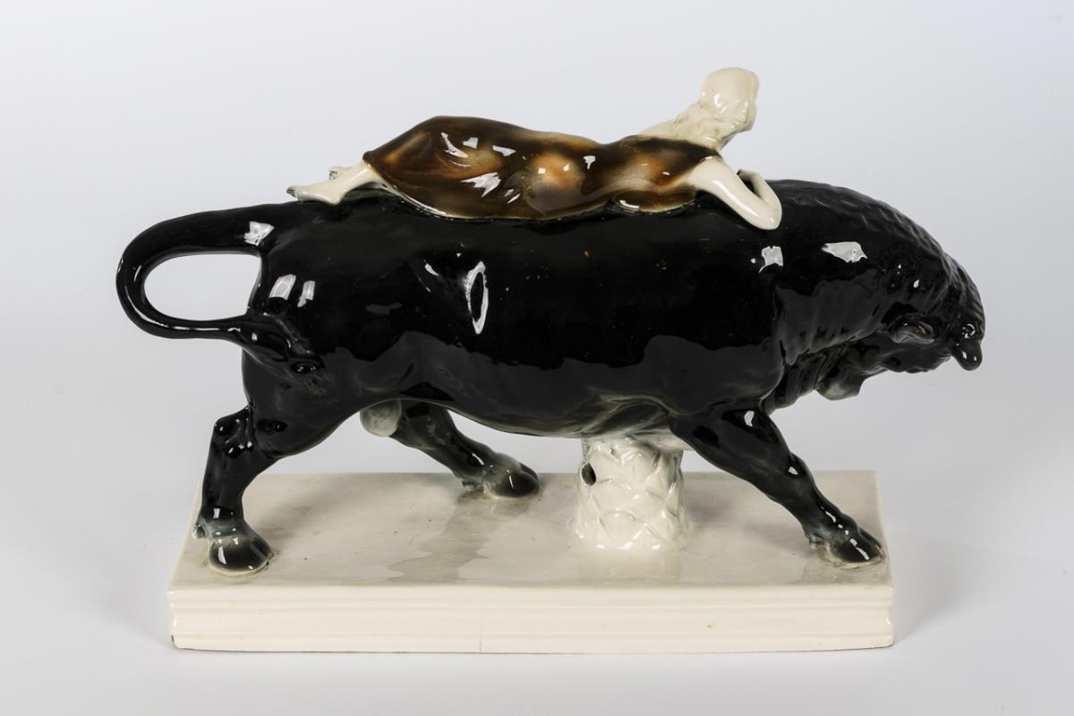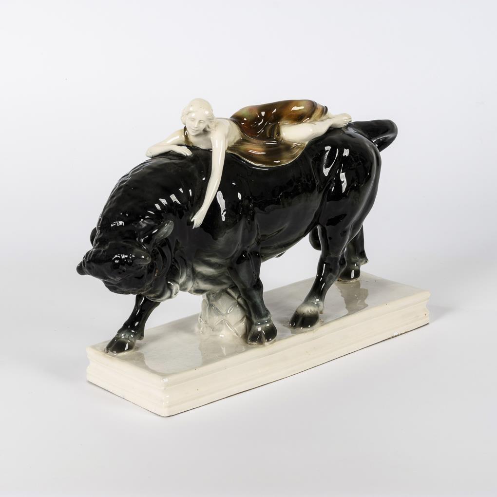 Weiblicher Halbakt auf einem Stier liegend und ihn zärtlich liebkosend, auf Rechtecksockel. Sockel unterseitig rissig, partiell bestoßen, Brandriss am rechten Hinterhuf.