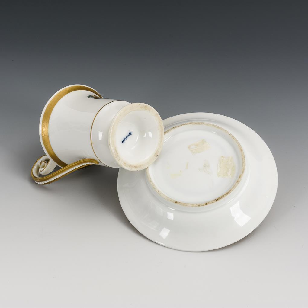 Polychrom bemalt, goldstaffiert. H Tasse 12 cm, Ø ergänzte Untertasse 14 cm.