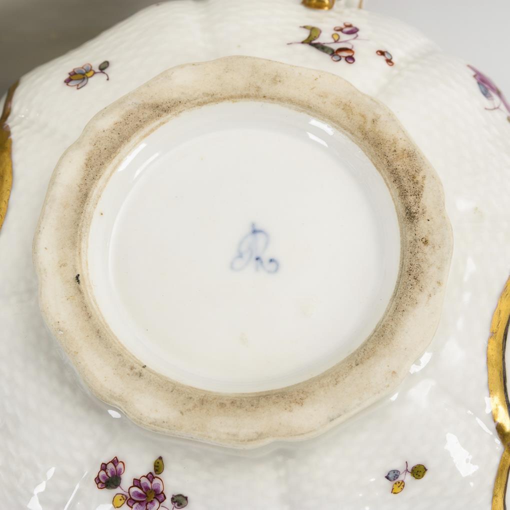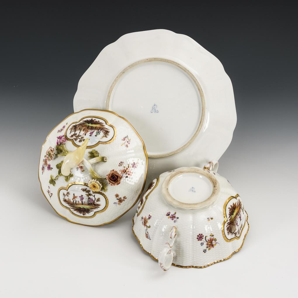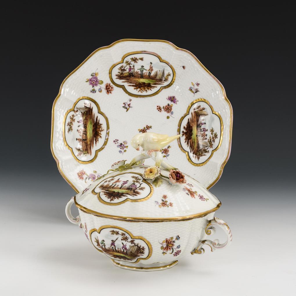 Mehrpassige Form mit Korbrelief, Terrine mit zwei Handhaben und Vogelknaufdeckel. Mit goldgerahmten Vierpassmedaillons, darin verschiedene Soldatenszenen. Minimaler Goldabrieb, Restaurierung am Deckelrand, Schwanz des Vogels restauriert.