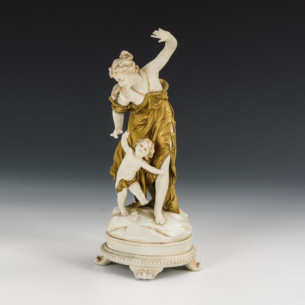 Auf einem Felssockel stehende junge Frau mit Knaben. 7 Finger bestoßen bzw. fehlen.