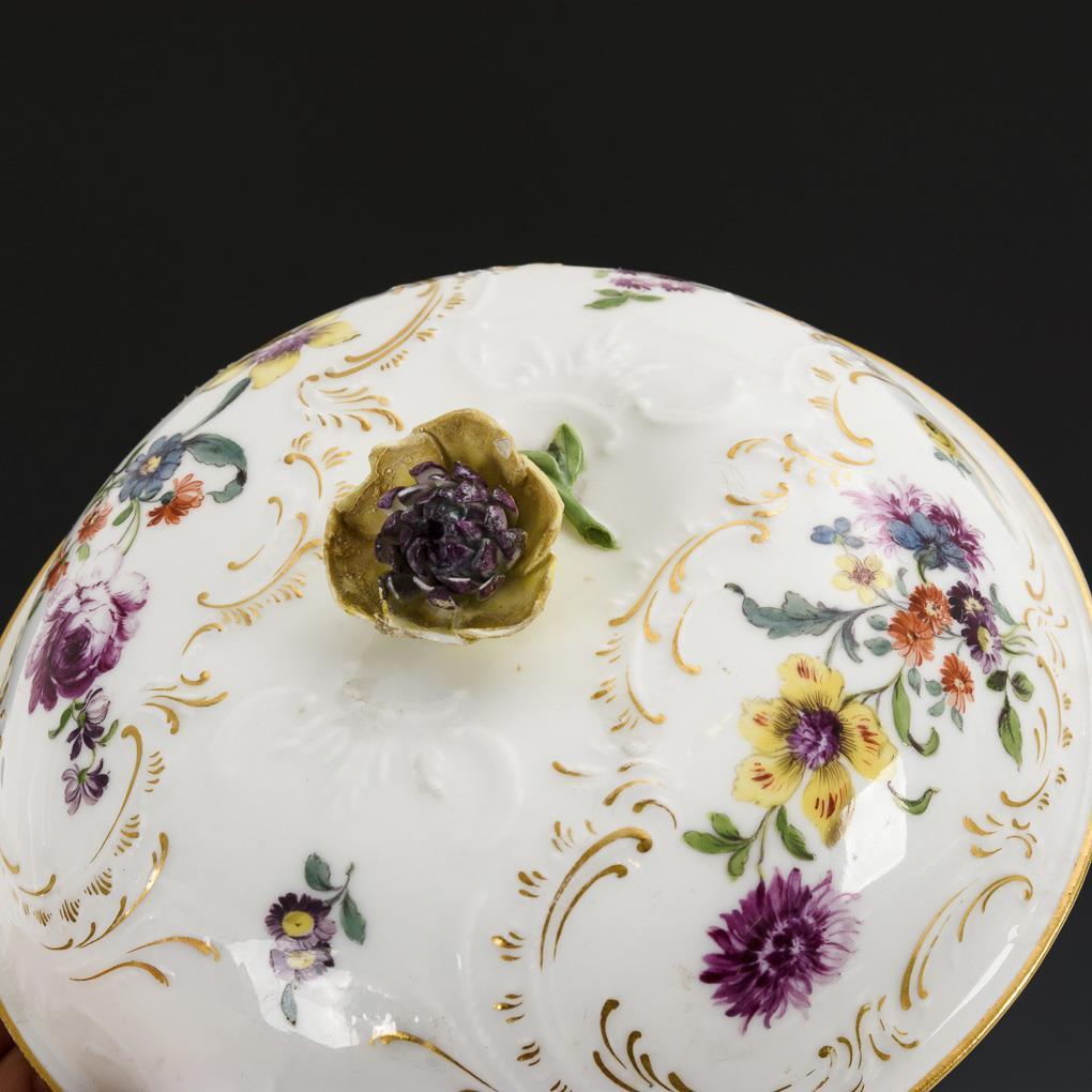 Terrine mit Rocaillerelief, zwei gewundenen Asthenkeln, Blütenknaufdeckel und Unterschale. Mit kleinen Blumenbuketts und Streublümchen. Gold berieben, Blütenknauf und 1 Henkelansatz bestoßen, partiell Blüten minimal bestoßen.