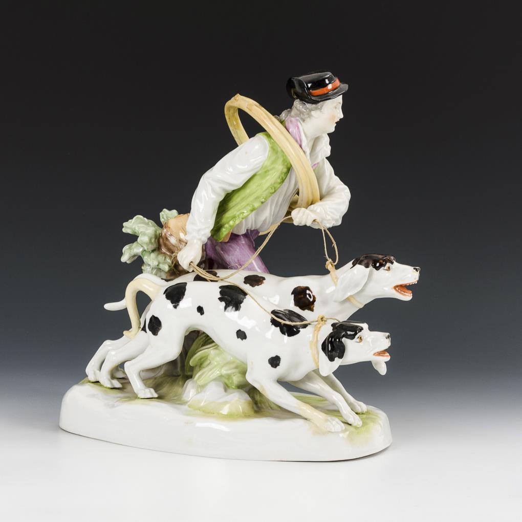 Laufender Jäger mit Jagdhorn und zwei Jagdhunden. 1 Hundepfote, 1 Hundeschwanz, 1 Halsband restauriert, Jagdhorn bestoßen.