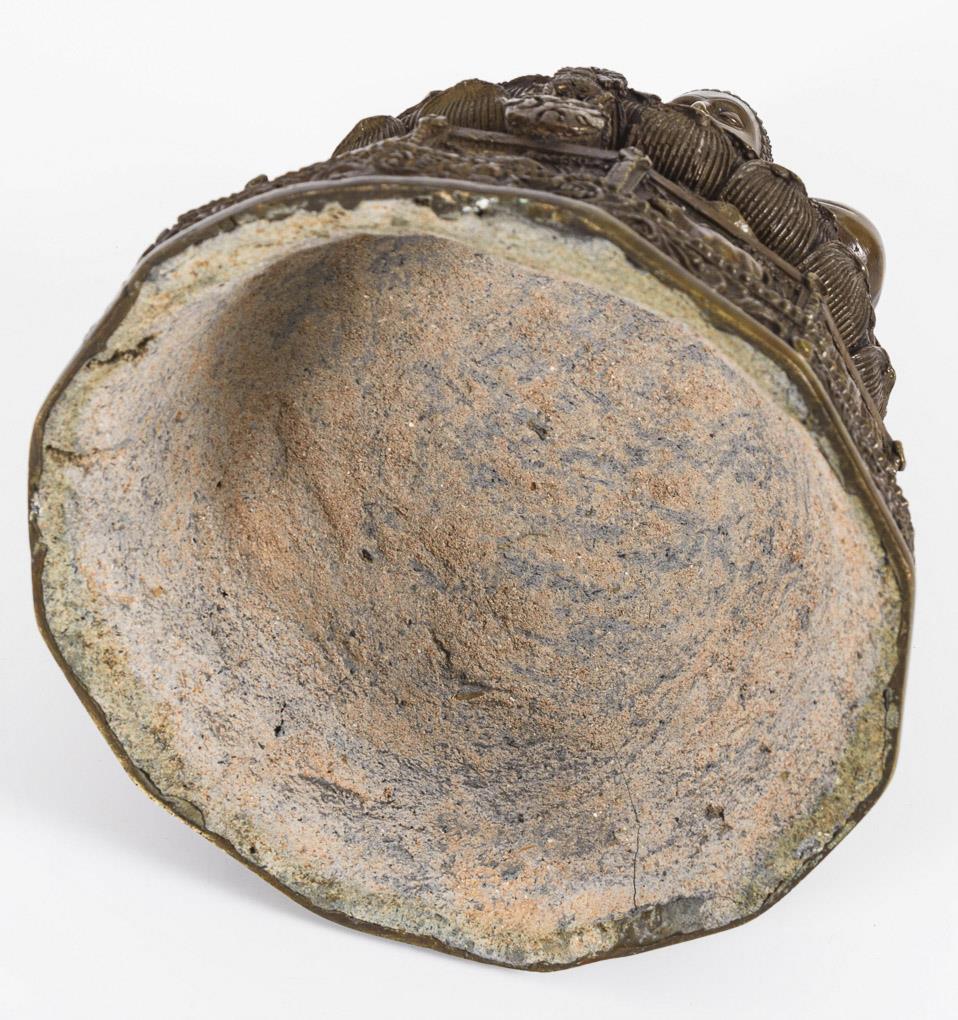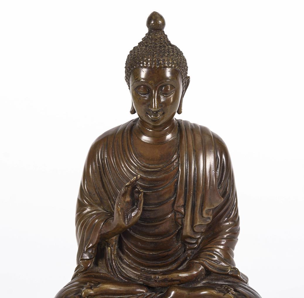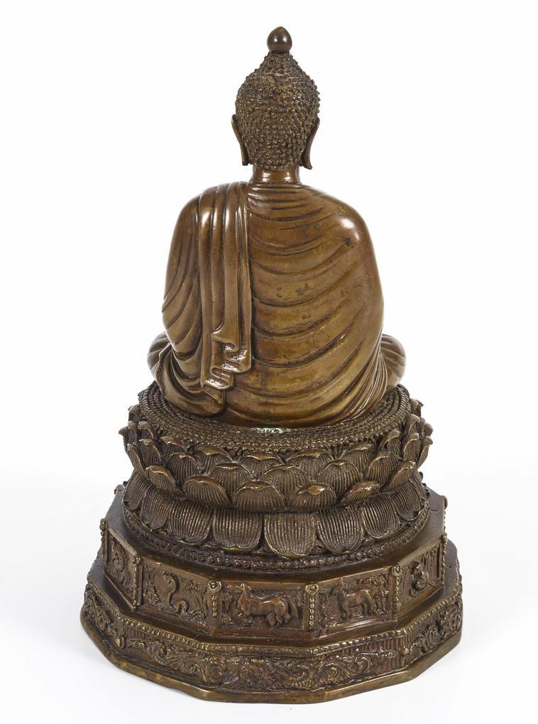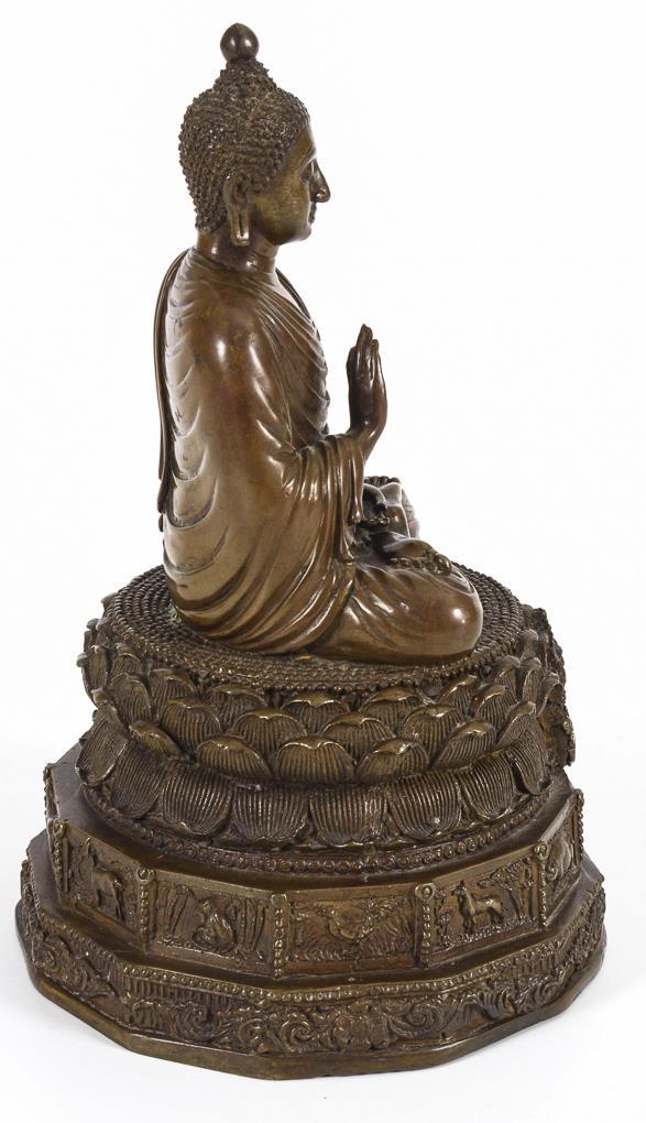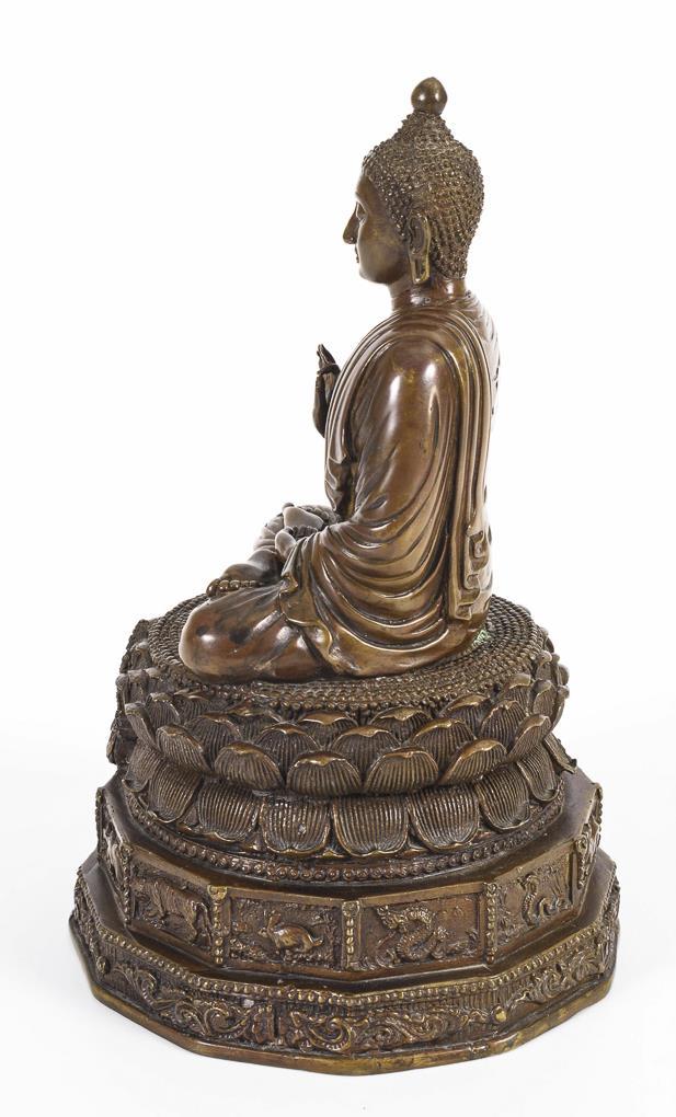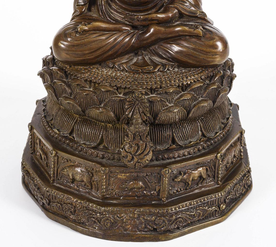 Auf hohem Sockel sitzender Buddha mit der Darlegungsgeste. Sockel mehrfach gegliedert in doppelten Lotosthron und umlaufend Tierkreiszeichen sowie Musterkante.