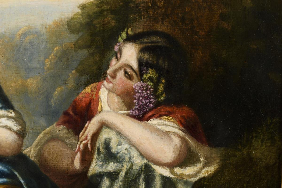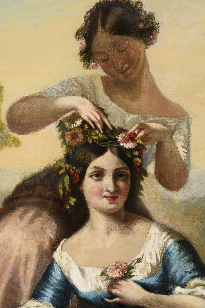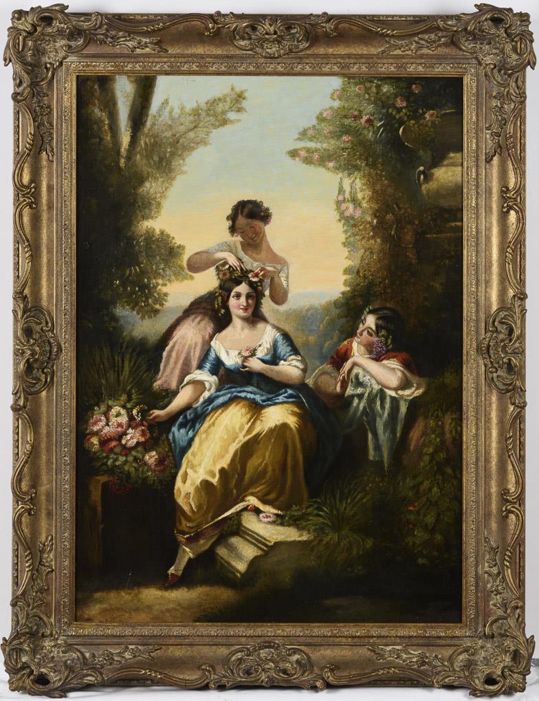 Drei jungen Frauen mit seidenen Kleidern und Blütenkränzen in schöner Parklandschaft. Leinwand doubliert.