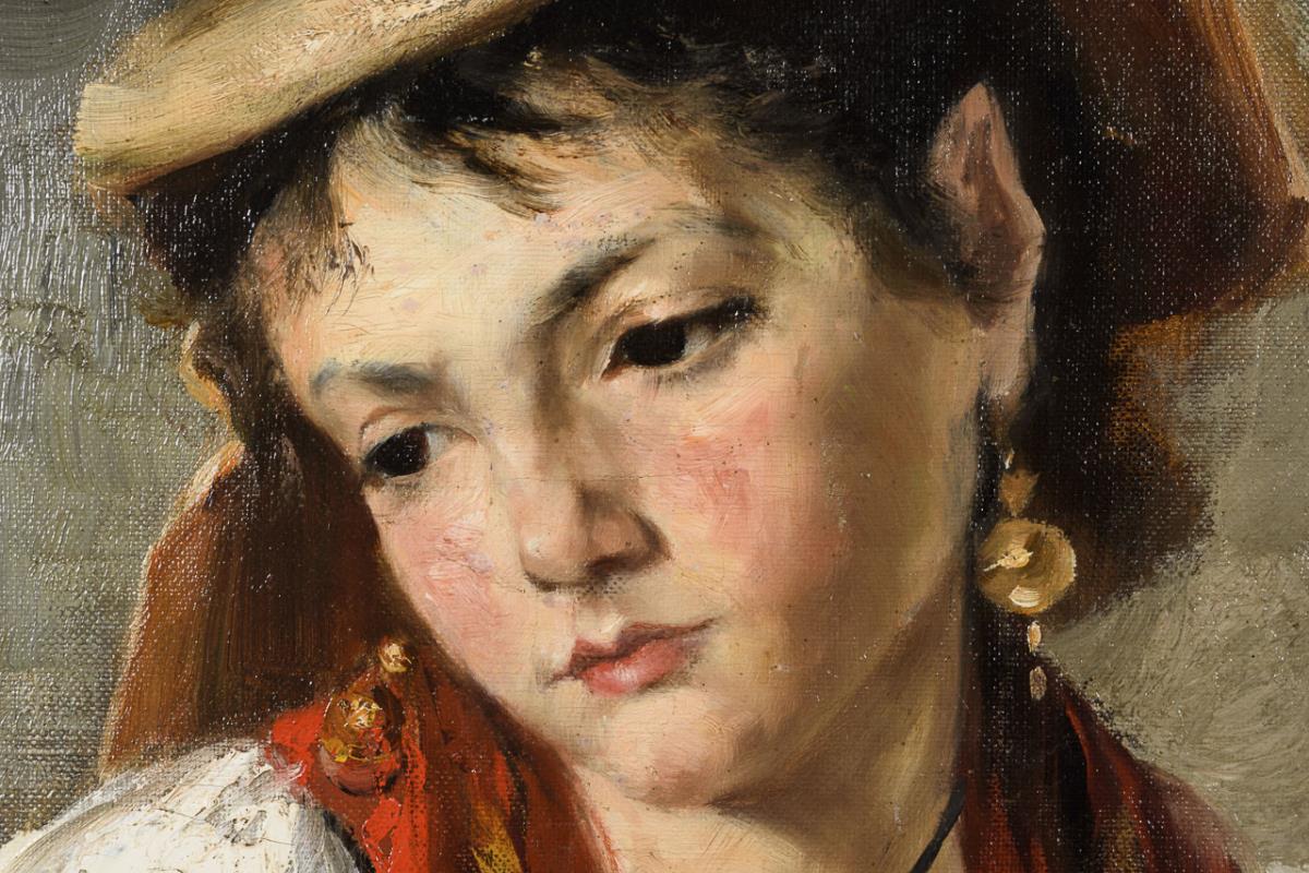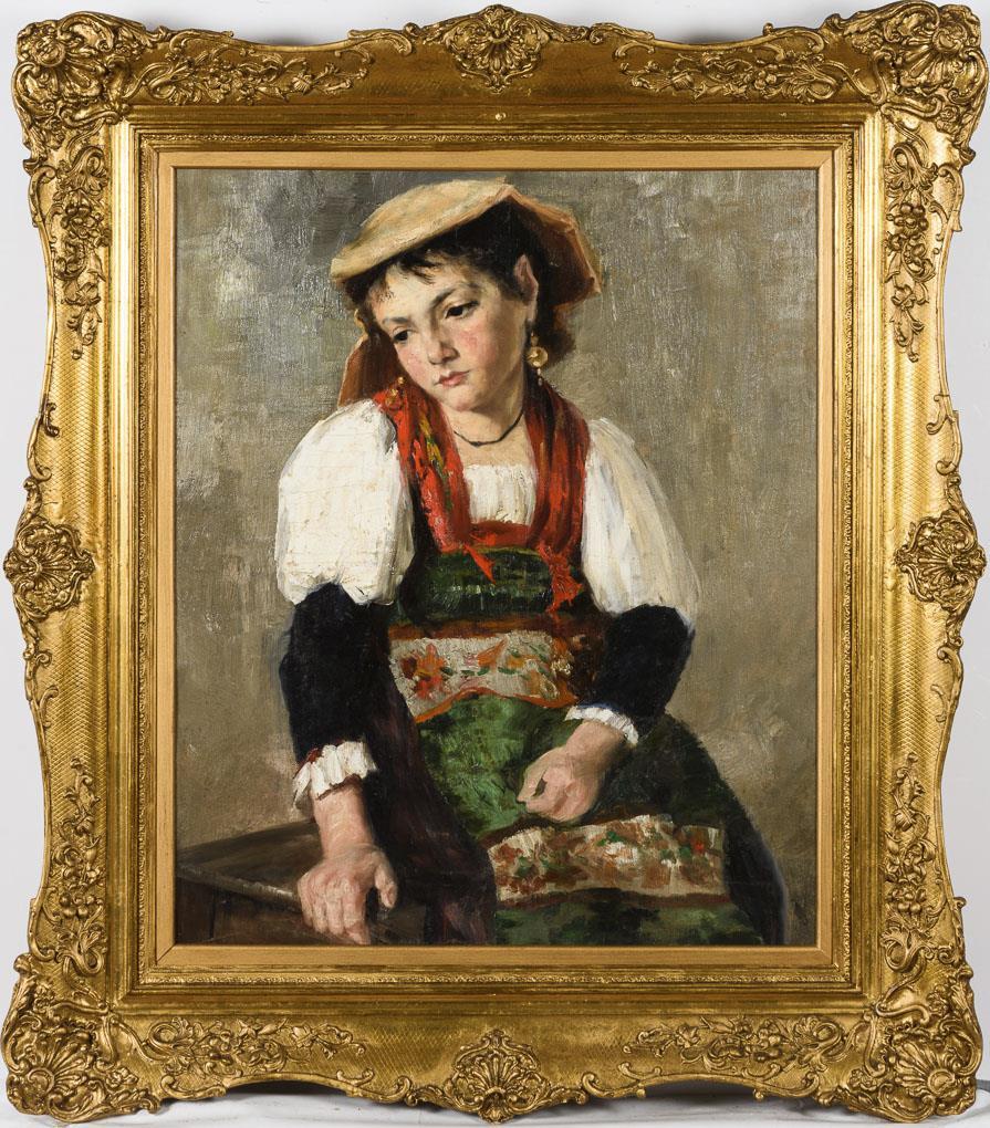 Porträt einer jungen Frau in Tracht, mit nachdenklichem Blick. Minimale Altersspuren.