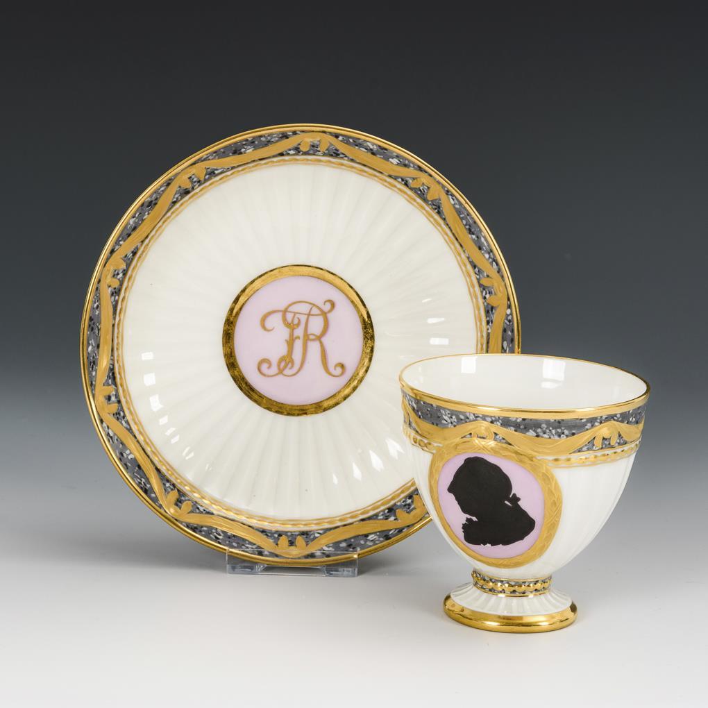 Gefußte, kannelierte Glockentasse mit Perlbandhenkel. Unter einer in Steinoptik gemalten, reliefierten und goldgravierten Tuchdraperie ein Medaillon mit der Silhouette des Königs Friedrich II., im Spiegel der Untertasse die Initialen "FR".