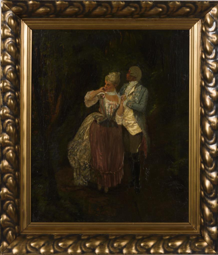 Adeliges Paar in der Mode des späten 18. Jahrhunderts, bei einem Spaziergang im Wald. Leinwand doubliert.
