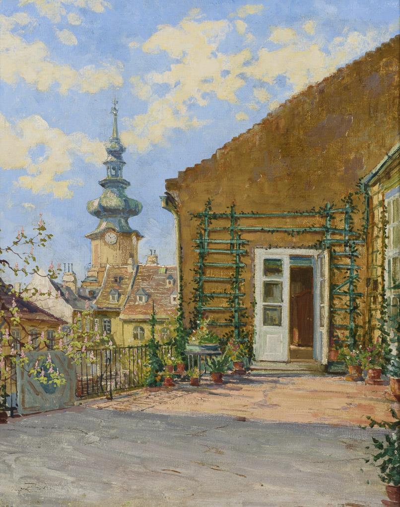 Blick von einer Terrasse über die Dächer der Stadt zum Kirchturm.