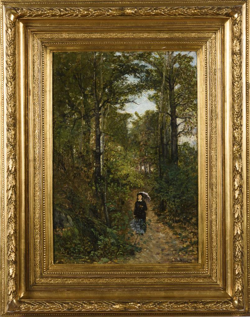 Junge Frau mit Sonnenschirm auf einem Waldweg am Hang. Altersspuren.