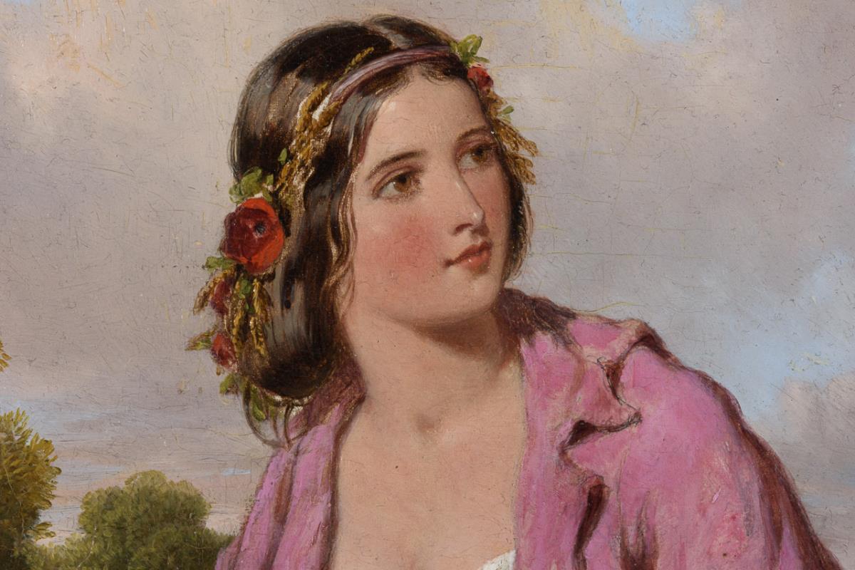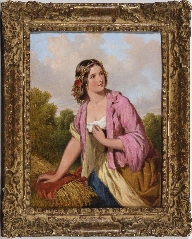Die junge Frau in ländlicher Kleidung mit dem Ährenbündel nahe einem Wald.