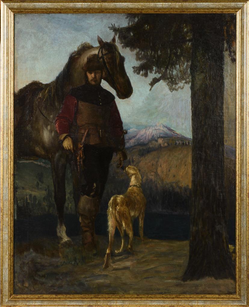 Jäger in historischer Kleidung, mit Blick über den See zu den Bergen unter blauem Himmel. Zwei kleine restaurierte Stellen.