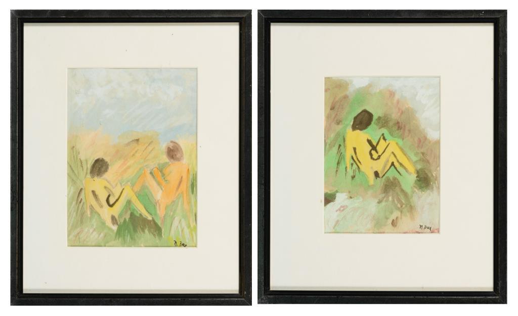 2 abstrahierte Werke mit weiblichen, am Wasser sitzenden Akten.