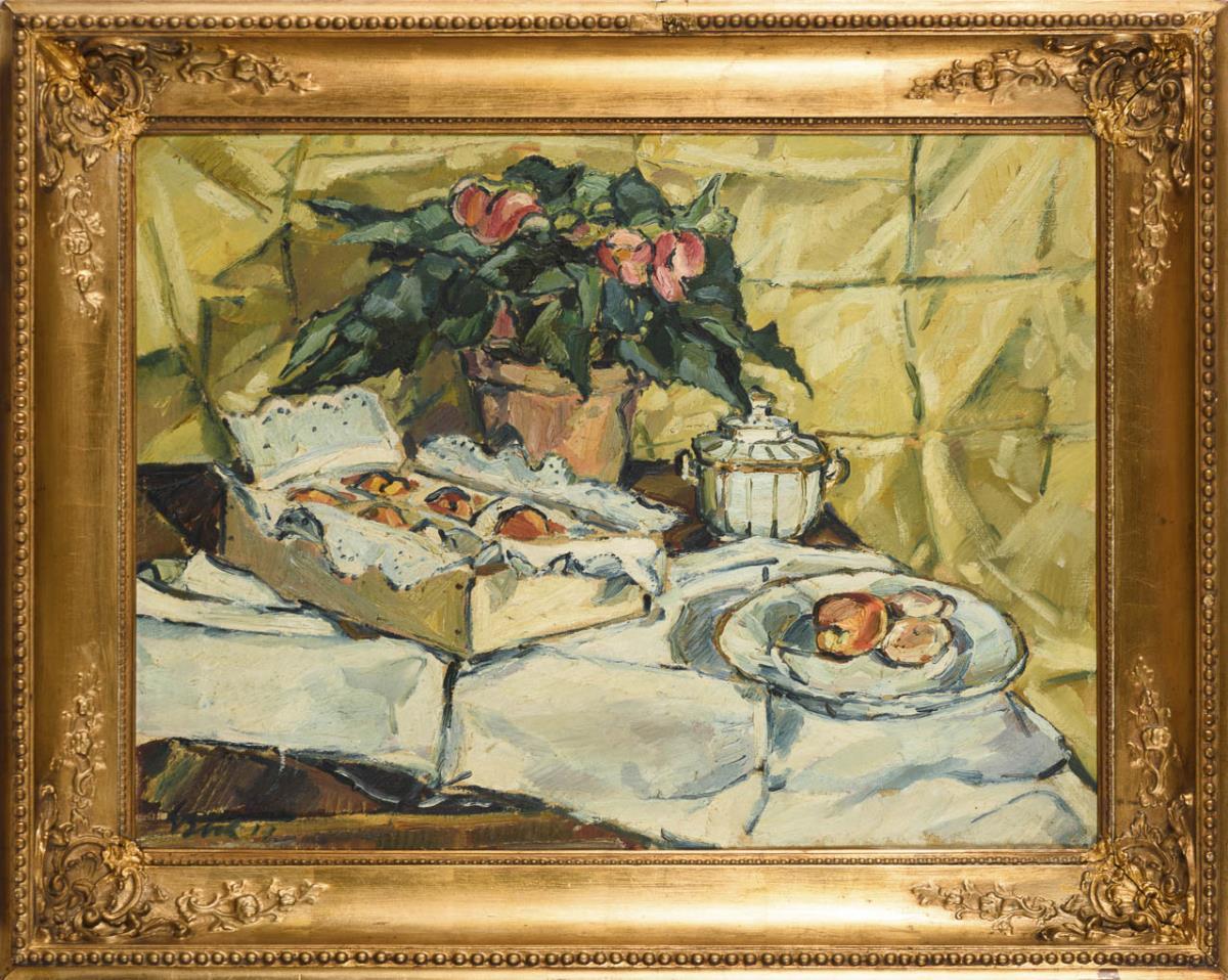 Apfelkiste neben Teller und Dose sowie einer blühenden Topfpflanze auf einem Tisch. Minimale Altersspuren.