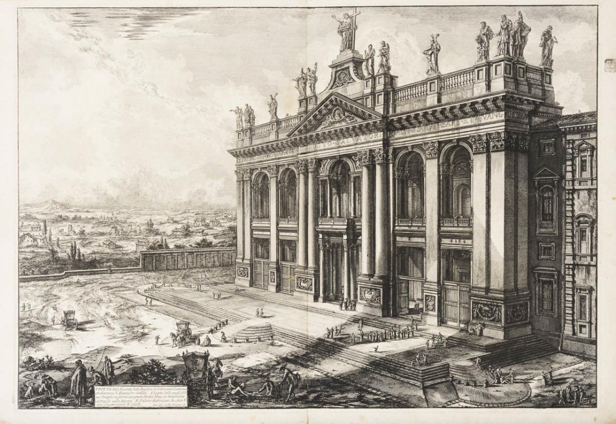 "Veduta della Facciata della Basilica di S. Giovanni Laterano [...]", aus: "Vedute di Roma" (1748 - 1774). Bugfalte, etwas stockfleckig.