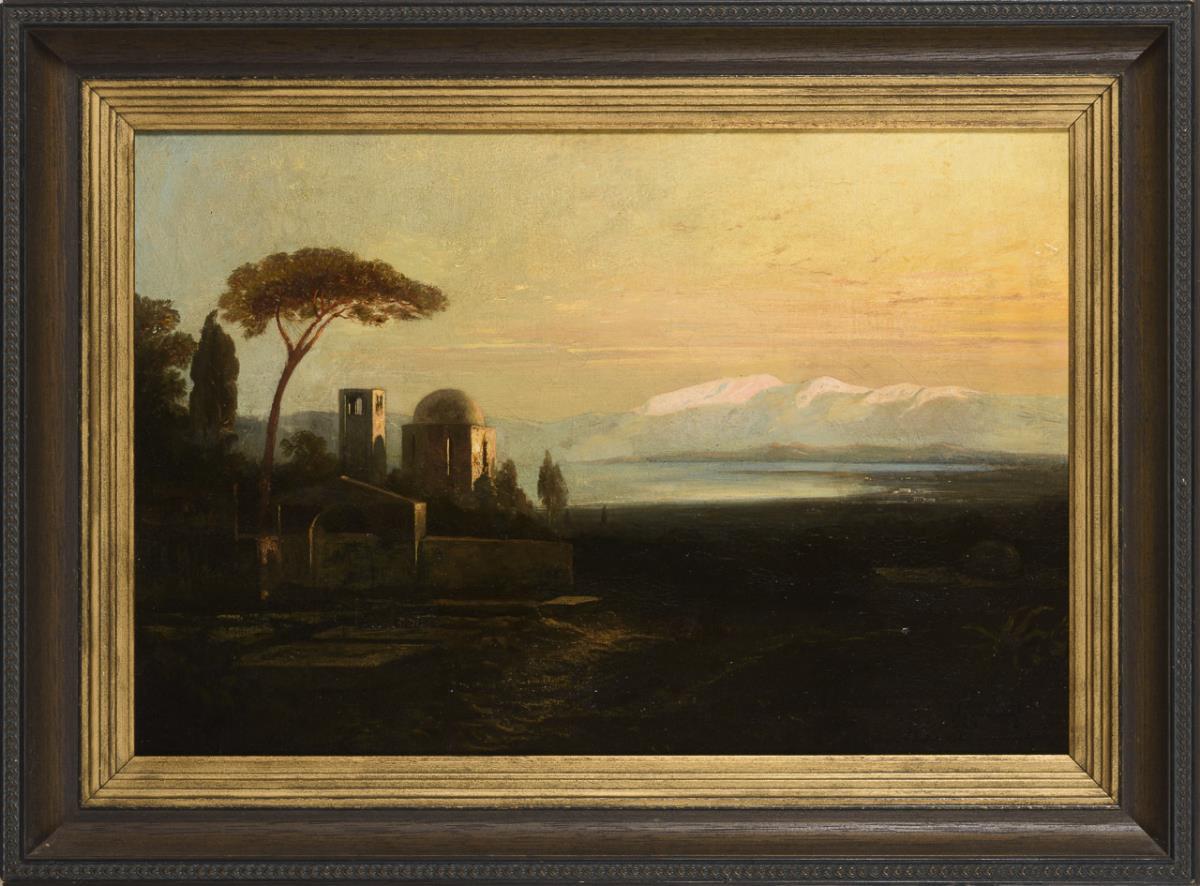 Kirchenbau in der Abendsonne mit Blick zum Gebirge am Horizont. Leinwand doubliert.