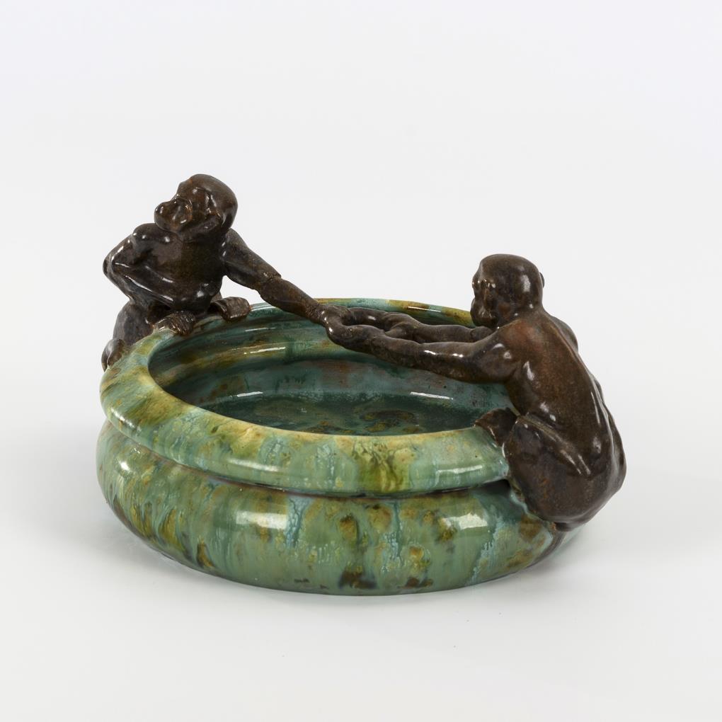 Flache Rundschale mit 2 plastischen, einen Ring haltenden Affen. Arme geklebt.