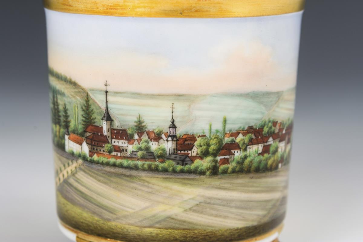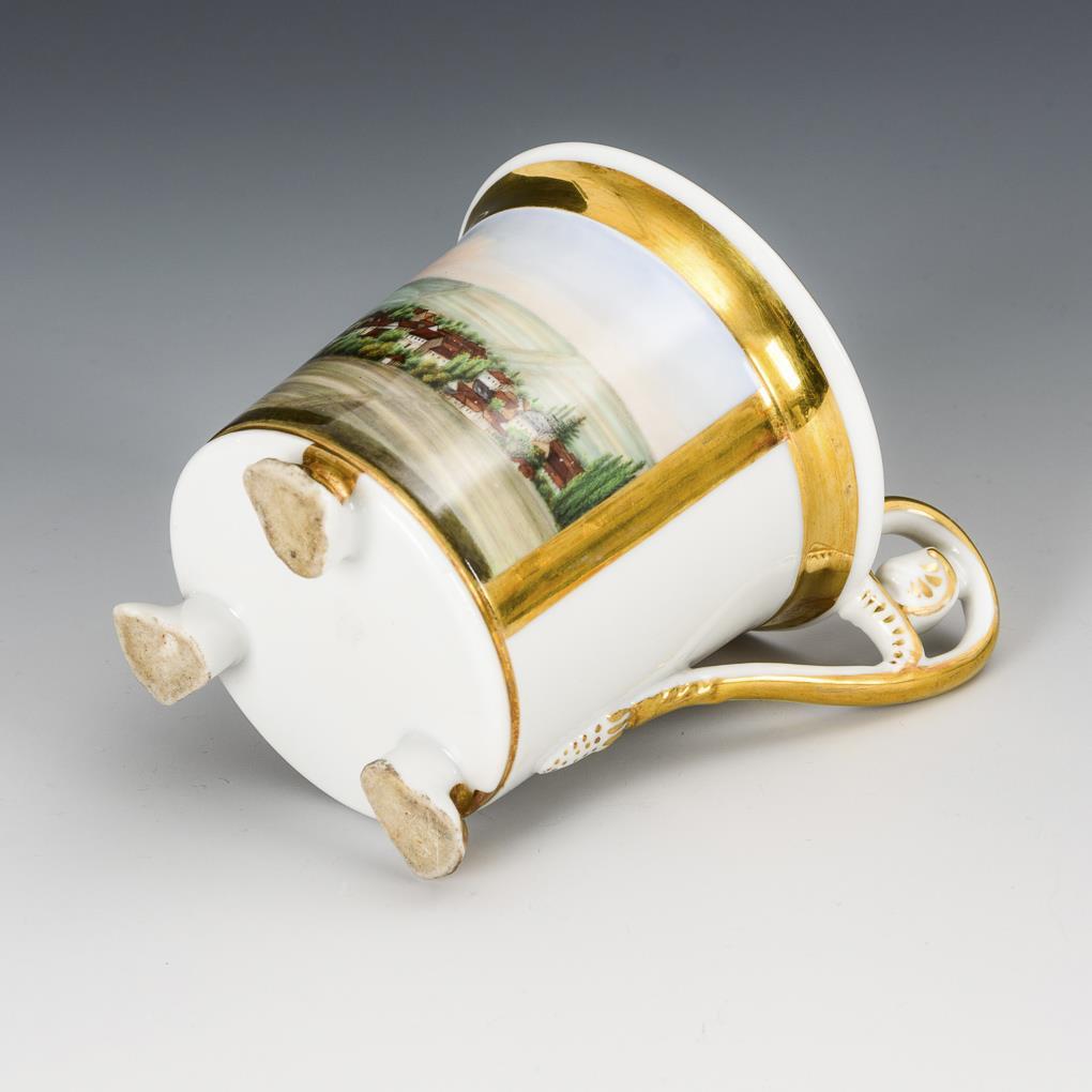 Zylindertasse mit Kraterrand, 3 Tatzenfüßen und Löwenkopfhenkel. Schauseitig eines Rechteckkartusche mit der Darstellung einer Stadtansicht.