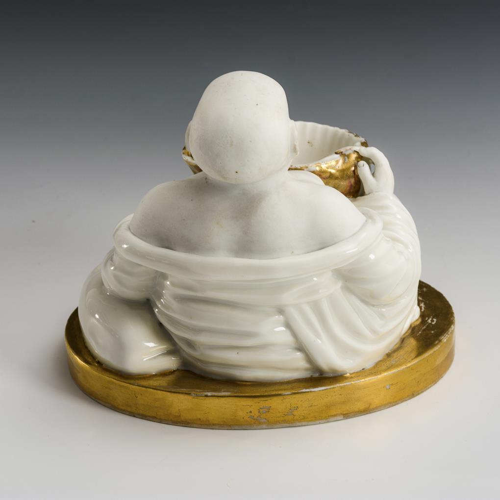 Sitzender Buddha, eine Muschelschale als Tintenfass sowie ein Füllhorn als Federhalter haltend. Gold berieben, Haarriss im Sockel.