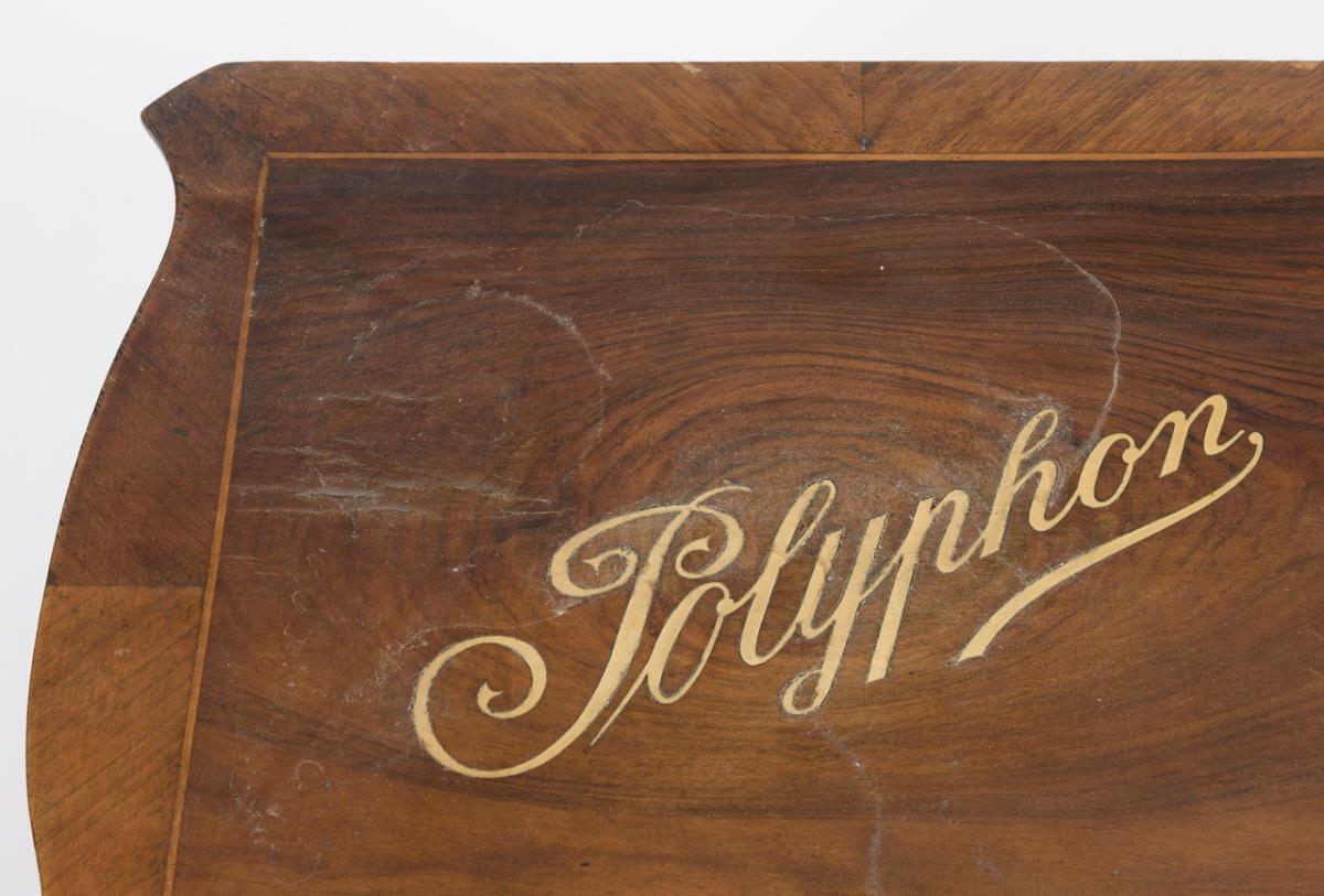 Auf dem Scharnierdeckel eingelassener Schriftzug "Polyphon". Um 1900.