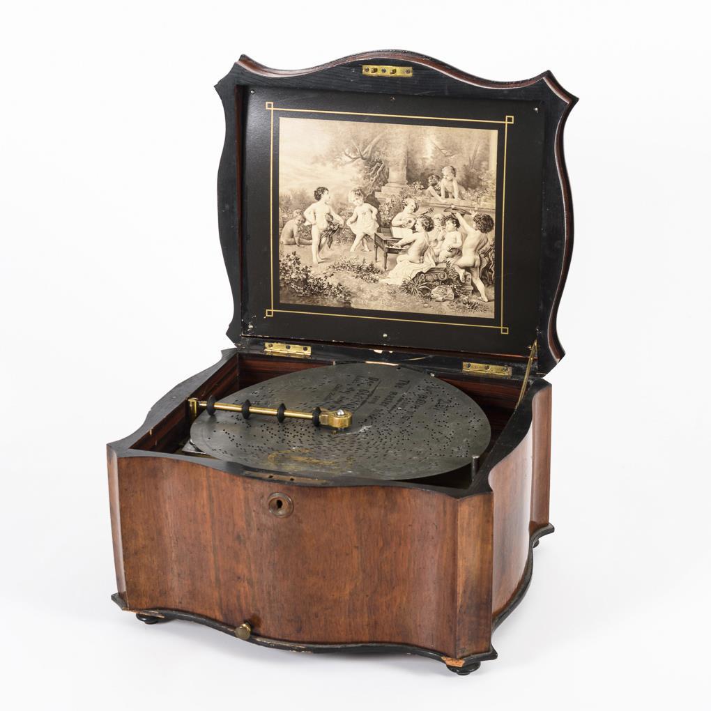 Geschweifter Korpus mit Stellhebel in der Front. Im Deckel Lithografie mit musizierenden und tanzenden Putten. "Spieluhr" mit Werk unter geriffelter und goldbronzierter Gusseisenplatte, Sternenrad mit Zungenkamm 12 cm, auf der Antriebswelle "50956". Lochplatten Ø 28 cm je "Polyphon" gemarkt (z.B. Stille Nacht, Die schöne Polin, Edelweiß usw.). Minimale Furnierschäden und Fehlstellen an der Bodenplatte, korrodierte Resonatoren (dadurch etwas verstimmt).