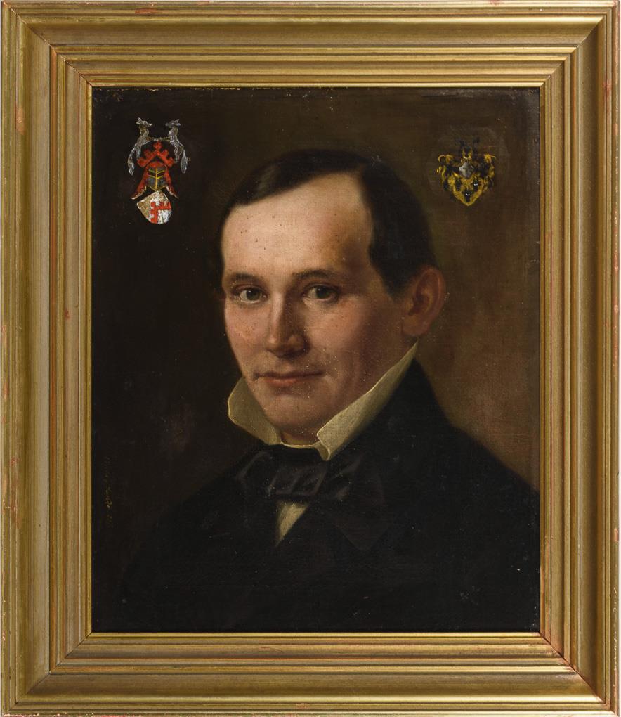 Bildnis eines jungen Mannes im schwarzen Anzug mit weißem Hemd. Bei den Wappen handelt es sich um die Adelsgeschlechter Buxhoeveden und Hastfer. Eine sehr kleine restaurierte Stelle mit Hinterklebung.