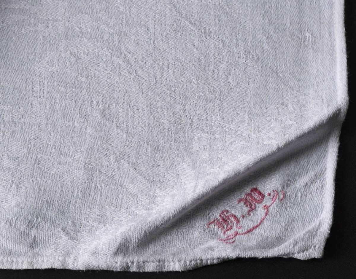Gewebtes Rosenmuster. Rot gesticktes Monogramm "HW". Einige wenige Alters-/Gebrauchsspuren.