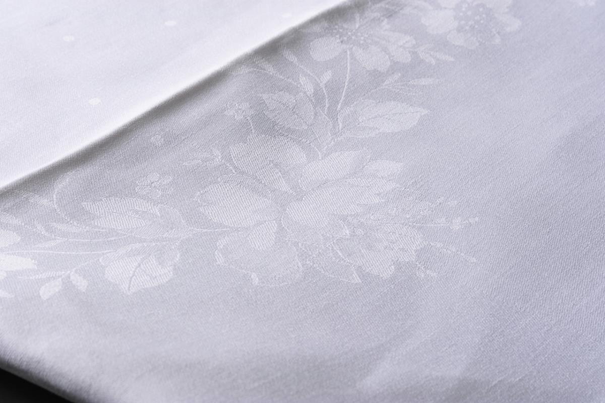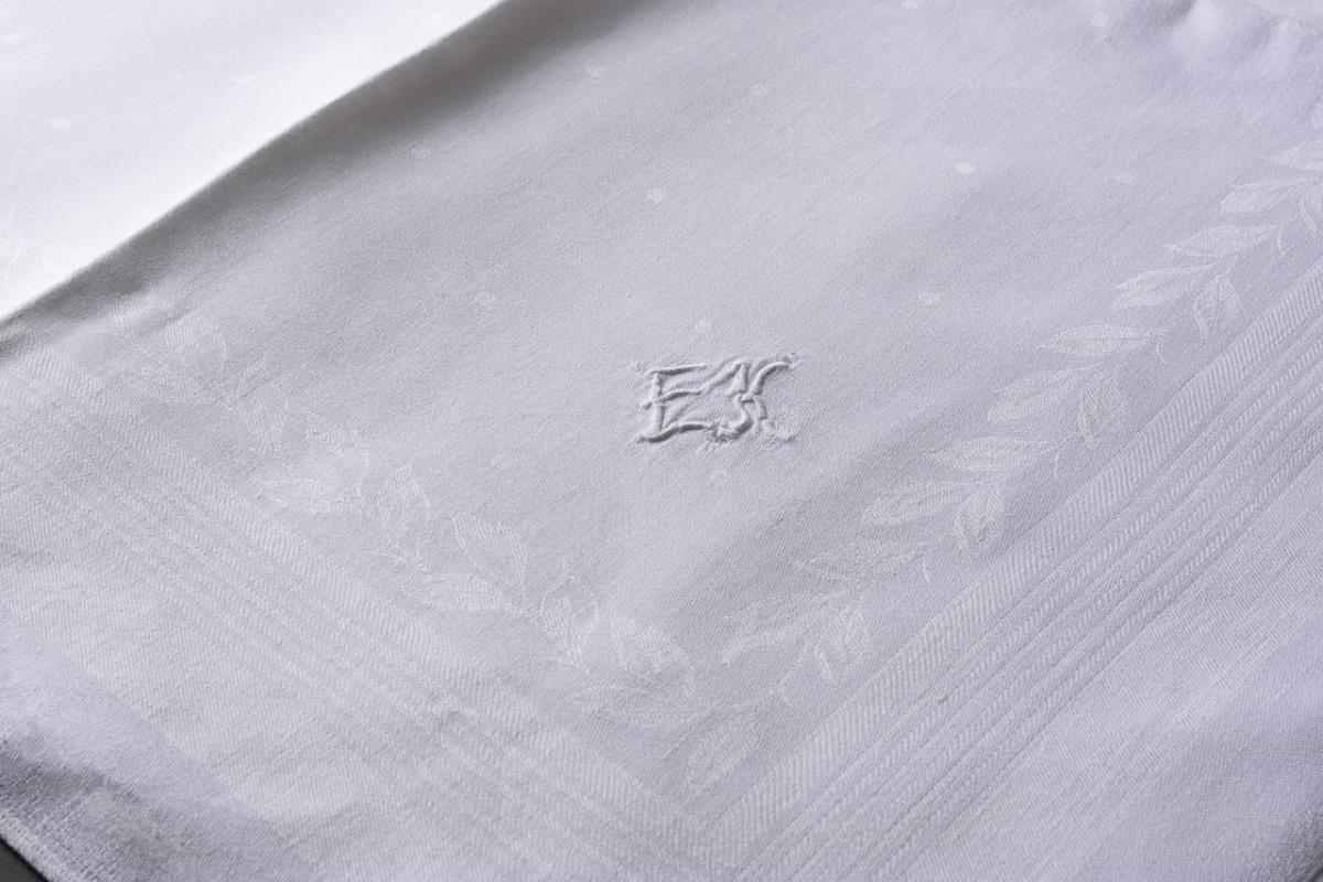 Rosenmuster, Bordüre mit Lorbeerkante. Gesticktes Monogramm EK. Kleine Löcher am Monogramm.