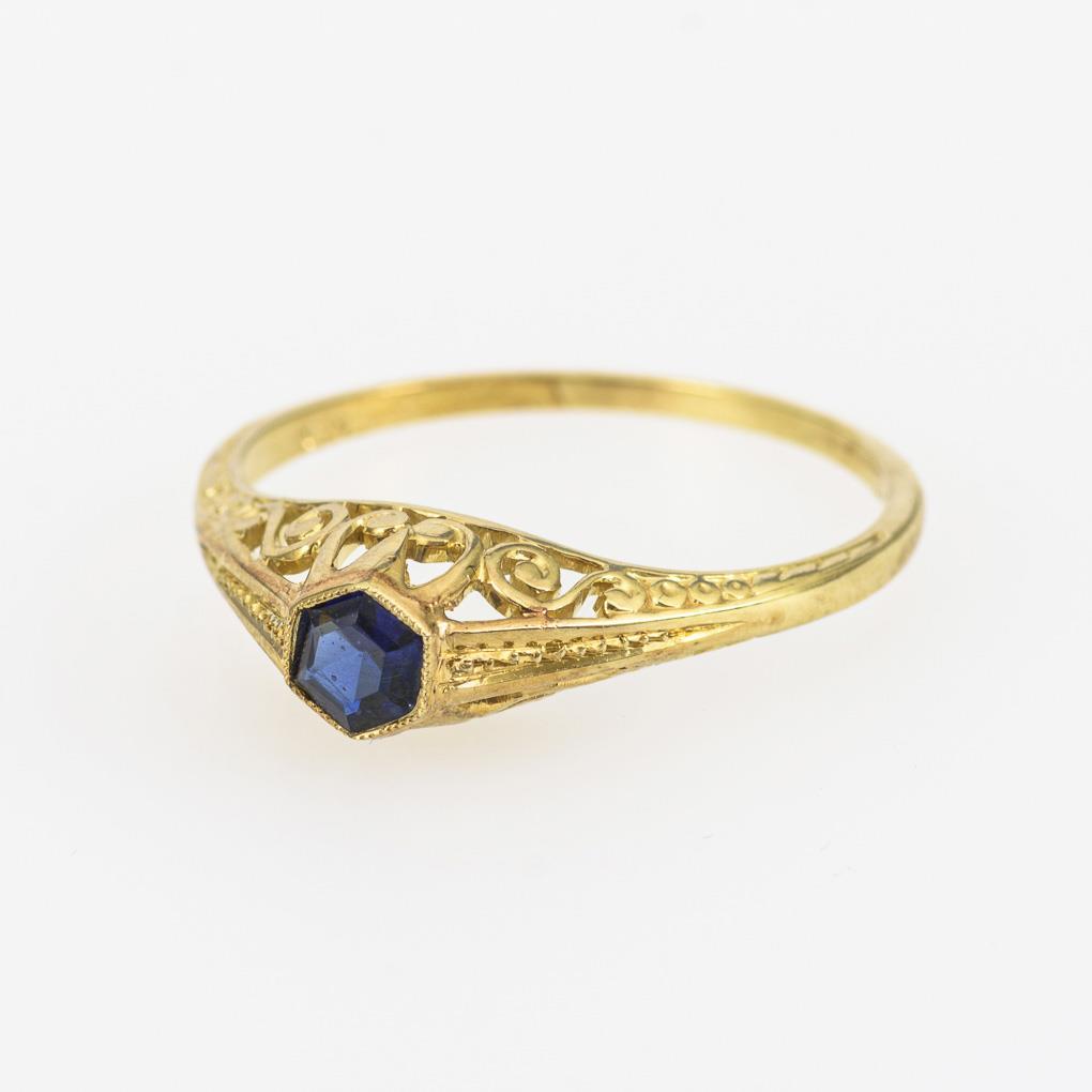 Kleiner, eingelassener Saphir in durchbrochenem Ringkopf. Schmale Schiene.