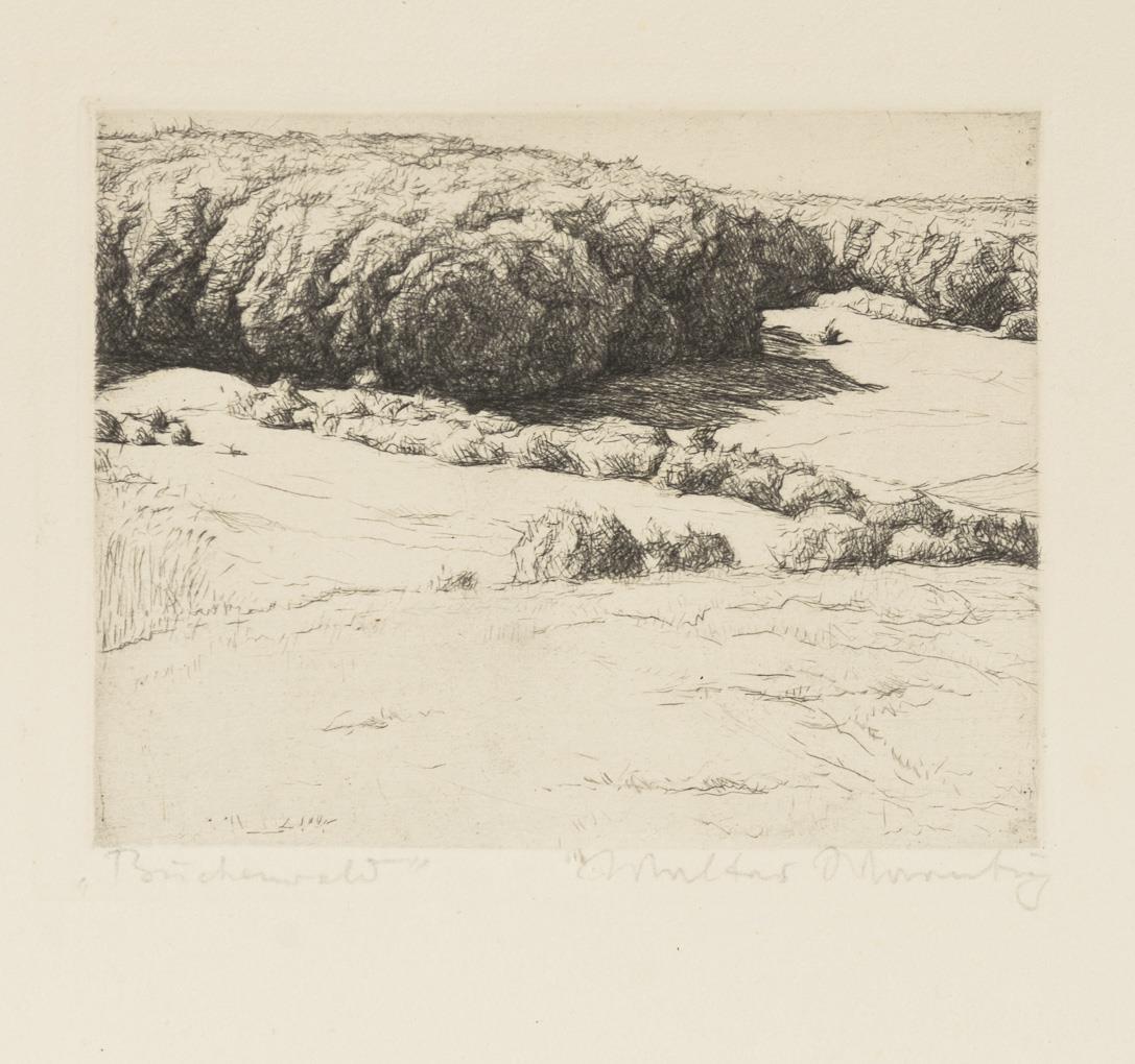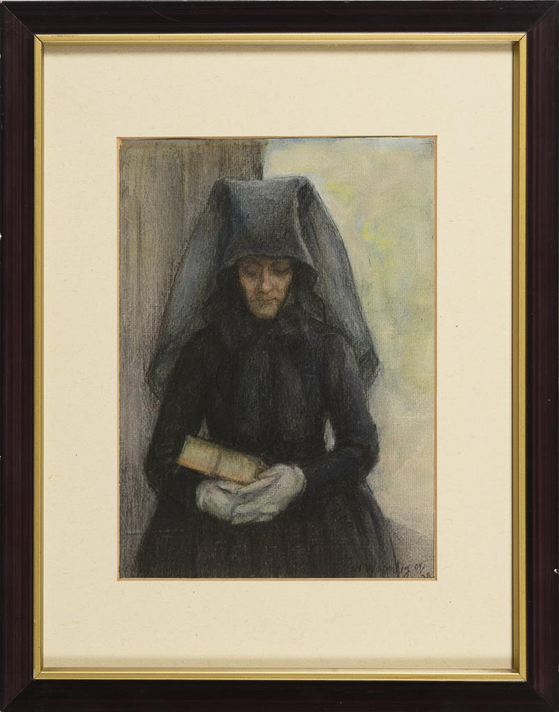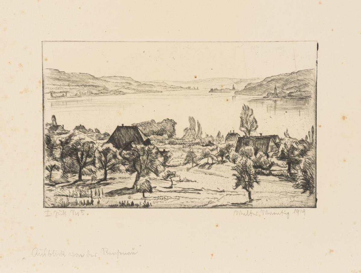 Handsignierte Kohlezeichnung einer "Frau in Trauerhaube" (verso betitelt), Passepartoutausschnitt: 29 x 20,5 cm, gerahmt und hinter Glas: 46,5 x 37 cm, datiert 04/[19]38 | 2 Radierungen, je mit Bleistiftsignatur: "Buchenwald", Platte: 14,5 x 18,5 cm, Blatt: 26,5 x 38 cm, Knick unten links sowie "Ausblick von der Reichenau", Platte: 15 x 24,5 cm, Blatt: 28,5 x 39,5 cm, 1. Zustand No. 5, 1919, etwas stockfleckig, Riss am oberen Rand.