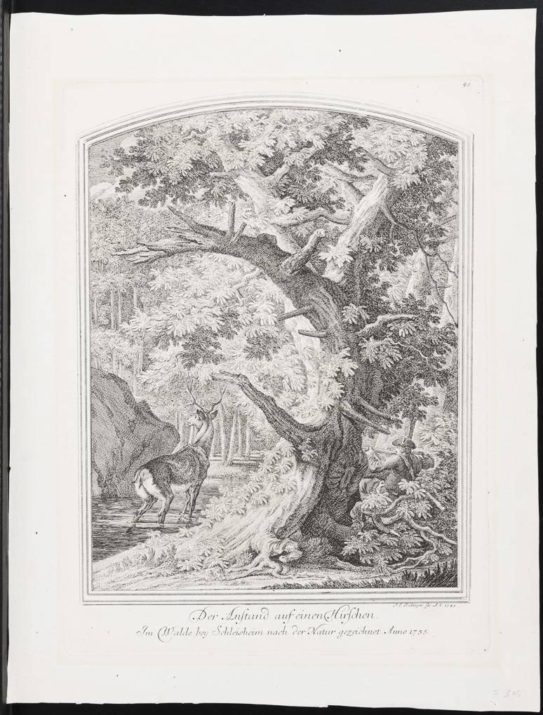 "Der Anstand auf einen Hirschen. Im Walde bey Schleisheim nach der Natur gezeichnet. Anno 1735", Platte: 33,5 x 24,5 cm, Blatt: 40,5 x 31,5 cm, nummeriert: 282 | "Selbst-Geschos auf ein Schwein in der Suhle", Platte: 24,5 x 36,5 cm, Blatt: 32 x 43,5 cm. Je mit leichtem Lichtschaden.