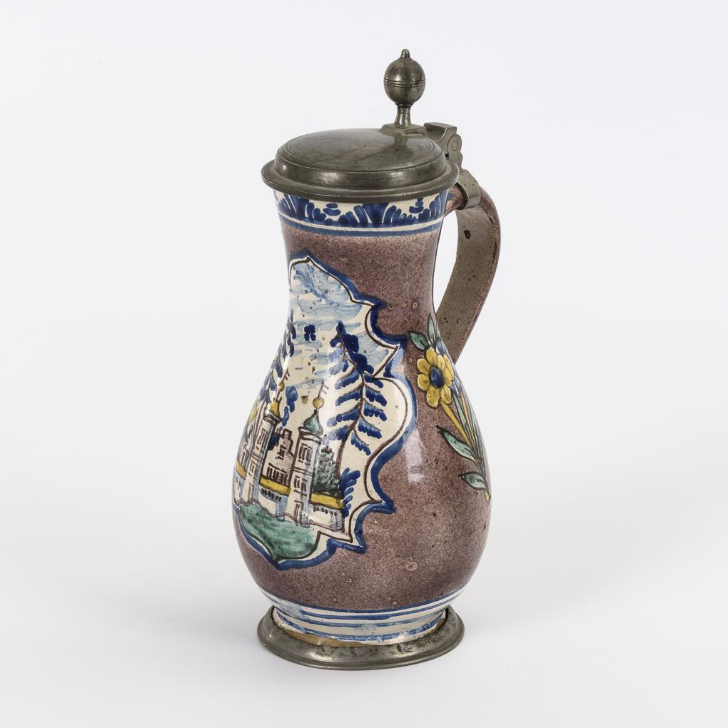 Birnform mit endvolutiertem Bandhenkel. Rocaillierte Kartusche mit einer Schlossansicht. Flacher Zinndeckel mit Kugeldrücker, Zinnstandring. Glasurdefekte, Alters- und Gebrauchsspuren.