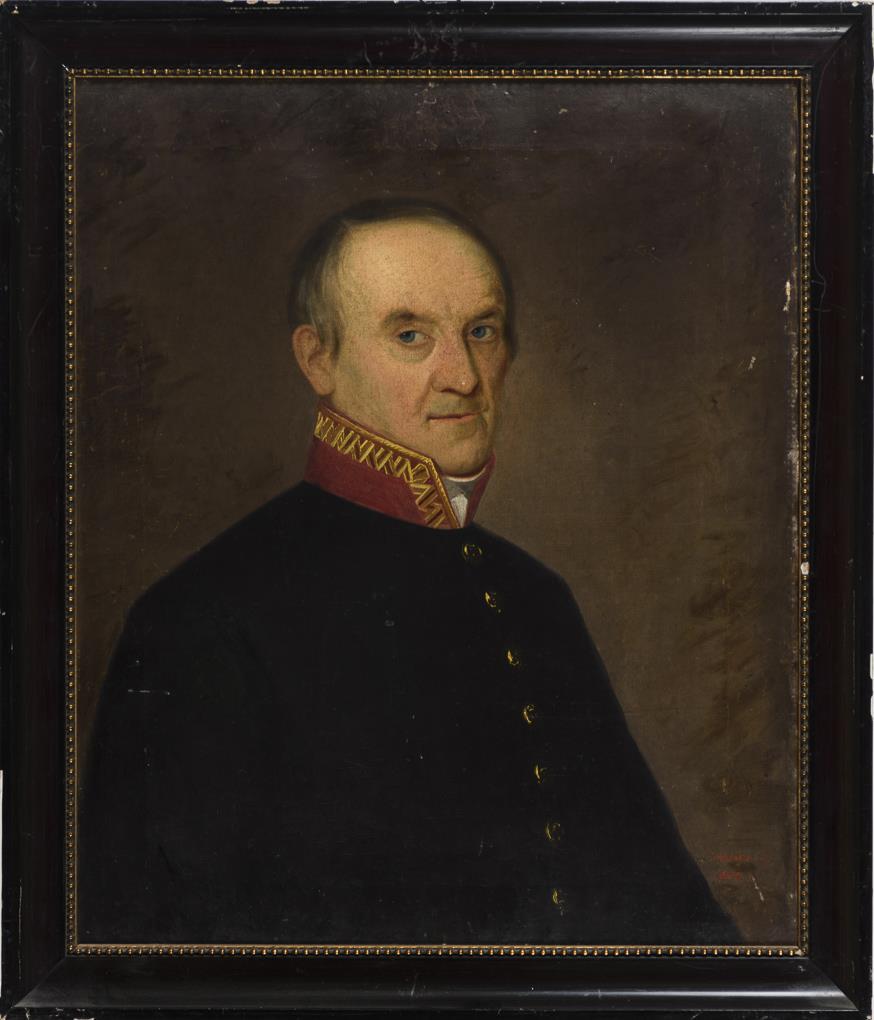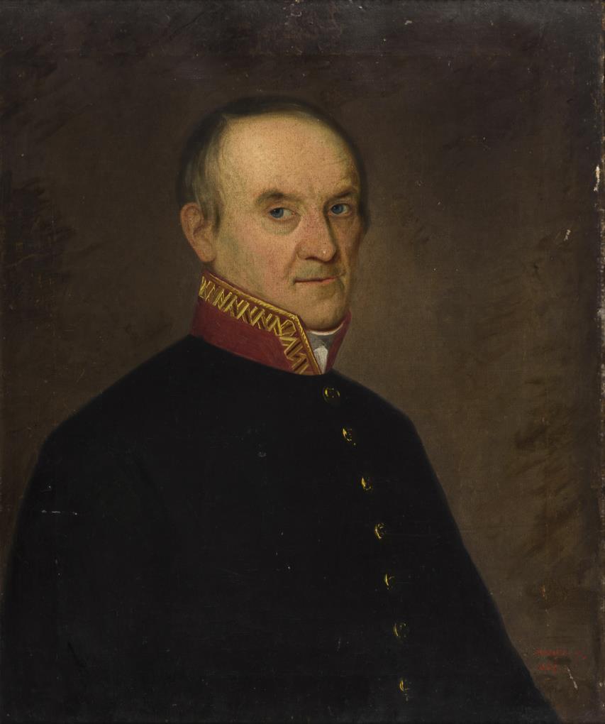 Porträt eines Mannes in dunklem Mantel mit rot-goldenem Kragen. Altersspuren.