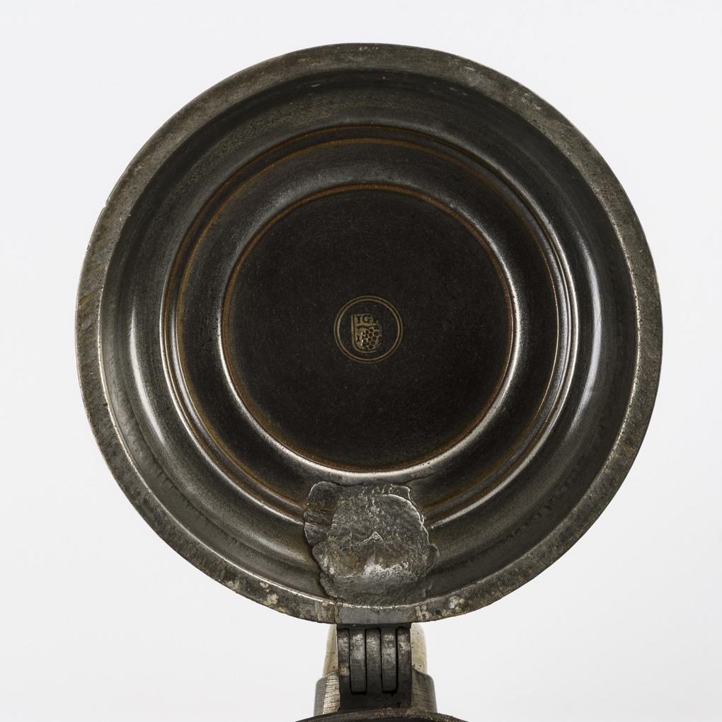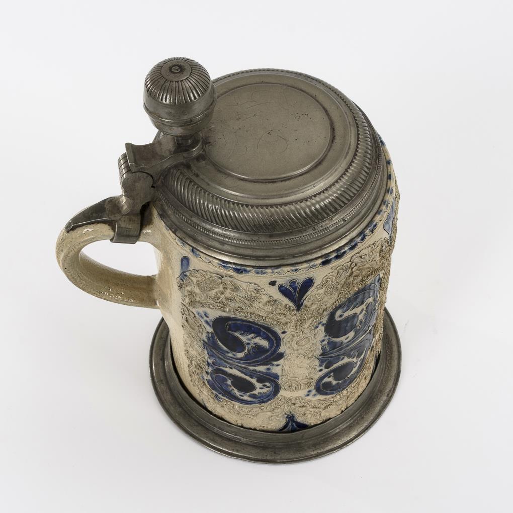 Modelkartuschen mit Blumen und Vögeln sowie gerolltem Blattwerk, Bandhenkel. Profilierter Zinndeckel mit großem Kugeldrücker, innen gepunzt, loser Zinnstandring. Feiner Boden- und Wandungsriss, umlaufender Haarriss im Mündungsbereich, Zinn teils mit Defekten.