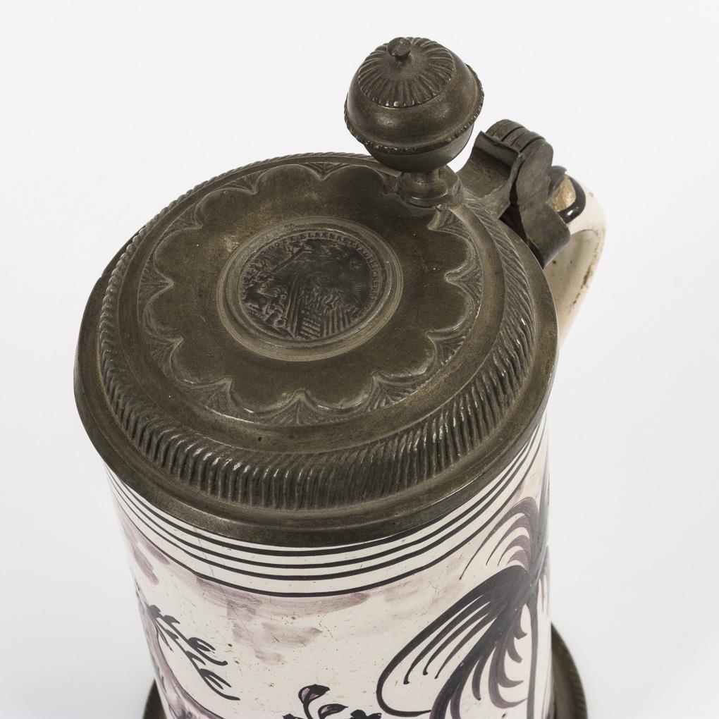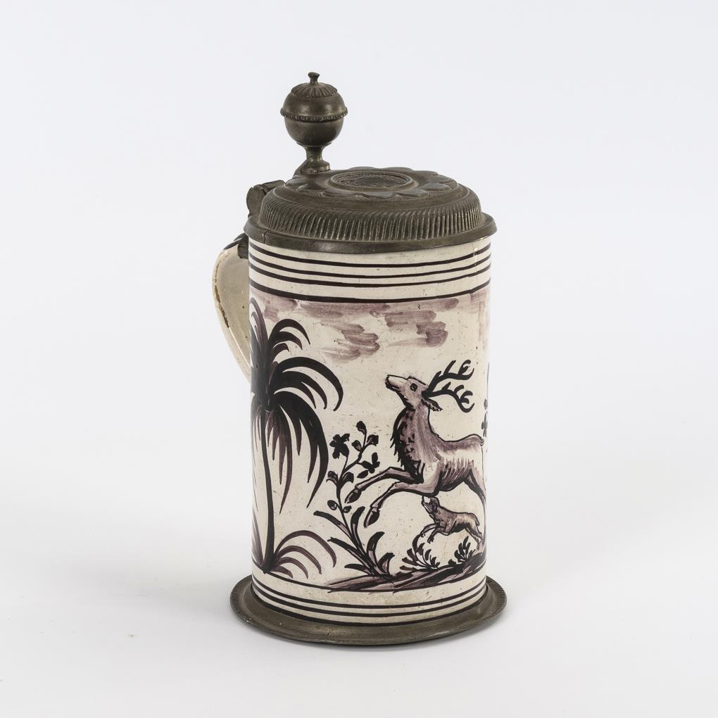 Zylinderform mit Bandhenkel. Schauseitig ein springender Hirsch und ein Jagdhund, flankiert von Palmbäumen. Profilierter Zinndeckel mit Reliefplakette und Kugeldrücker, Zinnstandring. Feine Bodenrisse, Mündungshaarriss, Glasurbereibungen, Zinn mit Defekten.