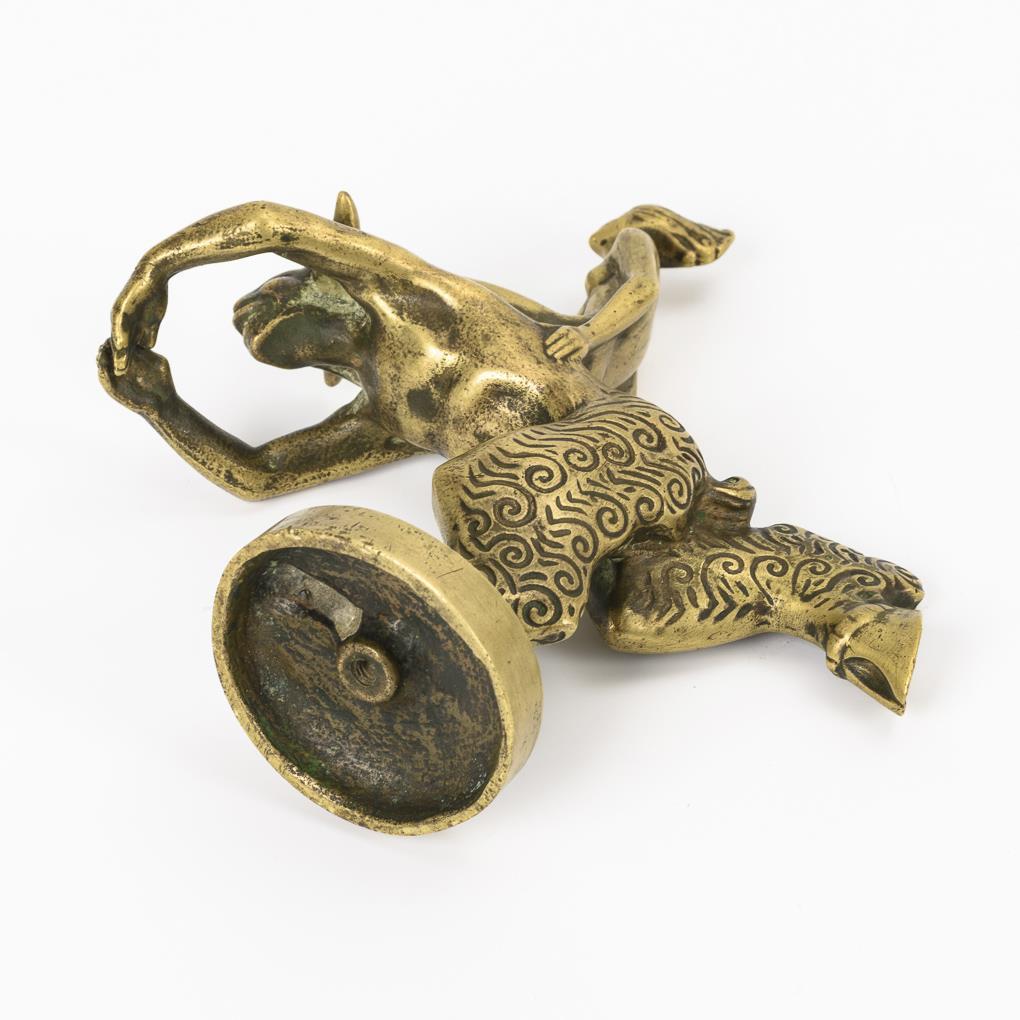 Stilisiert gearbeitete Gruppe mit voranstürmendem Faun, auf dem eine nackte Frau reitet. 1 Handgelenk des Fauns mit Haarriss, einige Alters-/Gebrauchsspuren.