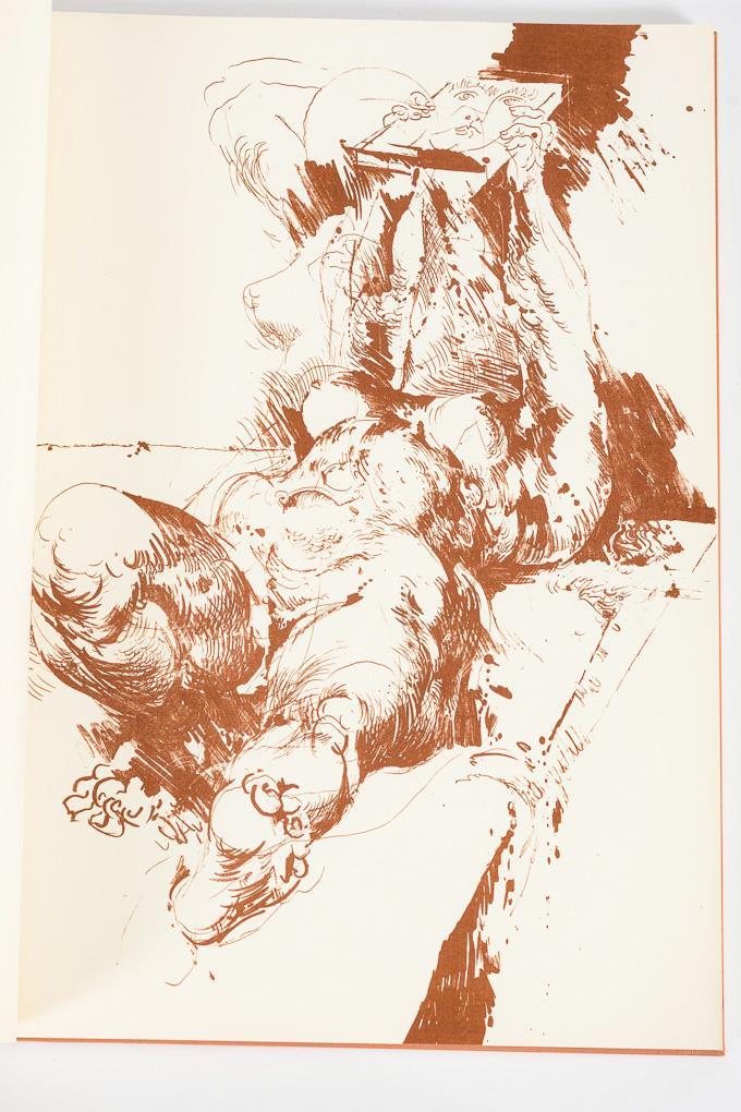 Nummerierte Ausgabe 223/600, im Impressum vom Künstler signiert. 76 Seiten inclusive 13 ganzseitigen Abbildungen. Japanischer Bindung, Halbpergamenteinband, Schuber, dieser minimal eingerissen.