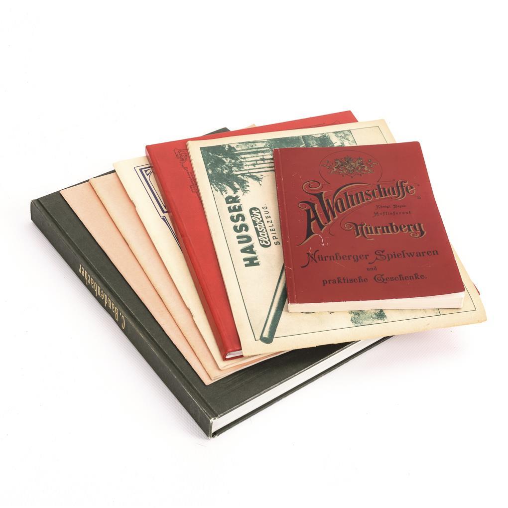 Vorwiegend Reprints von alten Katalogen. 3x Kibri: "Katalog Nr. 32" (2x) und "Musterbuch No. 4". / Ernst Plank "Katalog-Ausgabe 1903". / A. Wahnschaffe "Nürnberger Spielwaren um 1895". / C. Baudenbacher "Erste Nürnberger Holzspielwarenfabrik", Firmengeschichte und kommentiertes Musterbuch. / Originalkatalog Hausser "Elastolin Spielzeug 1939-40". Wenig Gebrauchsspuren.