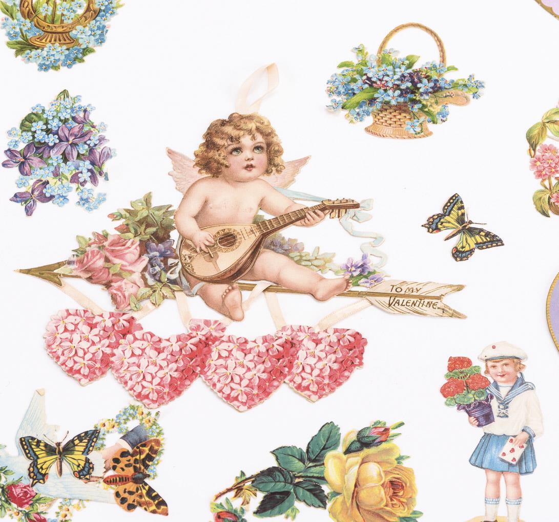 Geprägtes Papier und Pappe, teils lithografiert. Ca. 14 Glanzbilder (Oblaten), 3 mehrteilige Valentins-Anhänger "With Love" und ein geprägter Pappaufsteller mit Pfau. Teils mit Knickspuren.