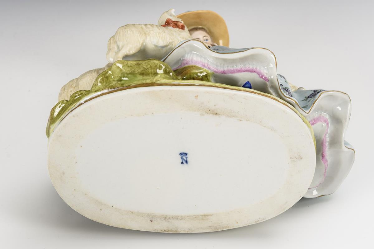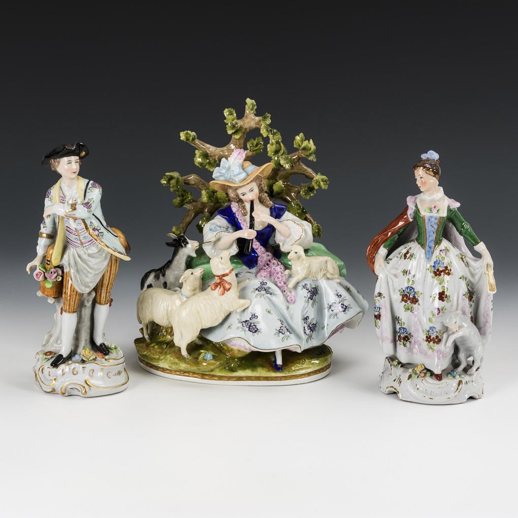 Vor einem Baum sitzende, flötespielende Schäferin mit drei Schafen und Ziegenbock (H 21,5 cm). / Rokokodame mit Lamm (H 19,5 cm) und Gärtner mit Rosenkorb (H 20 cm). Fächer der Rokokodame restauriert, 1 Lammohr bestoßen.